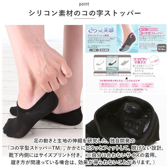 | 商品説明 | さらっと実感!脱げない「ココピタ」レディース用2足セットが新登場。【メッシュ構造でさらさらキープ】つま先と足底をメッシュ仕様にすることで、通気性アップ!足元がいつでもサラッと快適!【1秒吸水!】スピード速乾でべたつきを抑えてくれる!汗ばむ季節もムレにくいのが嬉しい◎【いや~なニオイも消臭】ニオイの元となる細菌の増殖を抑制する消臭効果も。気になる臭い悩みとバイバイ!【シリコン素材のコの字ストッパー】足の動きと生地の伸縮を研究した、独自開発の「コの字型ストッパーTM」。かかとにピタッとフィットして、脱げない設計。靴下内側にはサイズプリント付き。(※自分に合わないサイズの着用、履き方が間違っている場合は、効果が得られないことがあります。)【靴に合わせてチョイス】靴から見せない3種をラインナップ。スニーカー専用のスニーカー丈タイプ、ローファーに最適なやや深履きタイプ、パンプスにちょうどいい浅履きタイプ。洗い替えに便利な2足セット!(※スニーカー丈タイプは、口ゴムと足底のWサポートのスニーカー専用設計です。) |