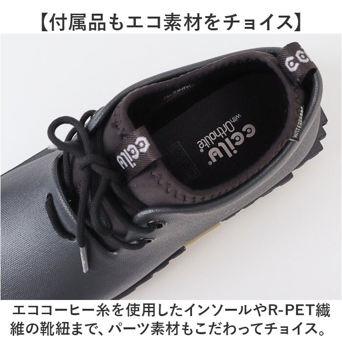 | 素材 | [本体]合成樹脂、コーヒー粕 [ソール]合成樹脂、ゴム、TPU [インナー]クロロプレンゴム、RPET、コーヒー粕 [インソール]ポリウレタン、RPET、コーヒー粕 |