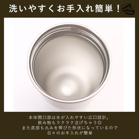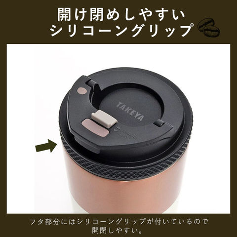 | 商品説明 | 機能性とデザイン性を兼ね備えた「タケヤフラスク コーヒータンブラー12」が新登場。本体内側と外側が真空断熱された、ステンレス2重構造タイプ。冷たいものも温かいものも、飲み頃温度をキープ!熱々の飲み物を入れても外側が熱くならず、氷を入れた時に結露で周りを濡らす心配が不要◎飲み口部分は片手で簡単にオープン!フラップを奥まで倒すと固定できるから、鼻に当たることなく飲みやすいのがポイント。開閉ロック機能付きで、持ち運びも安心。フタ部分に開け閉めしやすいシリコーングリップ付き。本体開口部は氷が入れやすい広口設計。飲み物もラクラク注げちゃう◎底部が丸みのある形状で、お手入れがカンタン。容量は約350ml。ご自宅でもオフィスでも活躍。底面に滑り止め付き。転倒防止にはもちろん、デスクなどに置いた時の衝撃や音を和らげる効果も!本体は仕上げの異なる2トーンカラー。ステンレスの素材感を活かした、上品でスタイリッシュな仕上がり。 |