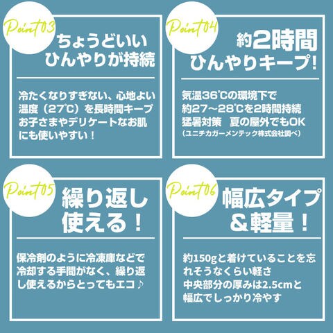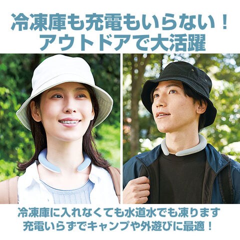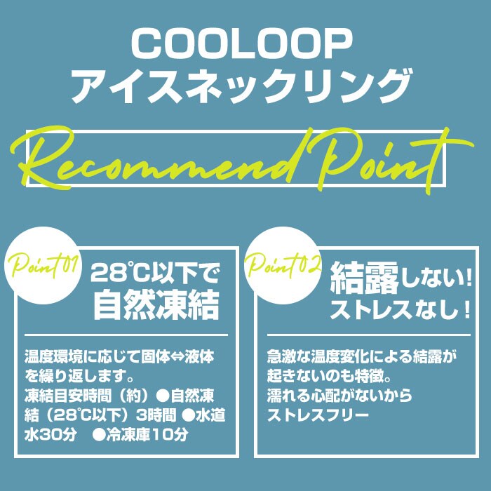 | 商品説明 | スポーツ中や夏の屋外でも、即効クールダウン!猛暑対策に威力を発揮する冷却グッズ「COOLOOP アイスネックリング(Lサイズ)」が新登場。【ひんやり約2時間キープ】身体全体を冷やすには、首すじの血液を冷やすことが効果的。幅広タイプのリングを首にフィットさせるだけで、ひんやりと心地よい涼しさが持続。(※気温36度の環境下で、約27度~28度の冷たさを2時間持続。)【気温28度なのに、凍る!】リングの内部には、温度調節機能を持つ特殊素材「PCM(オクタデカン)」を充填。28度以下で自然凍結し、約27度を長時間キープする驚きの次世代素材!【首にサッと掛けるだけ!】装着方法はとっても簡単。リングの先端を前方にして、首にはめるだけ!コンパクトで軽量だから、持ち運びに便利で、スポーツ時でもジャマにならないのが嬉しいポイント。【幅広タイプでしっかり冷やす】首への接触面が大きい幅広タイプのLサイズなので、より涼しさが長続き。【冷却・充電不要でとってもECO】保冷剤のように冷凍庫などで冷却する手間がなく、繰り返し使えるからとってもエコ♪(※28度以下でひんやりとした個体に変化しますが、冷凍庫で冷やすことで冷却時間を短縮することが可能です。)【快適なままひんやり】結露もしづらいため、肌や衣服が濡れることなく快適なひんやりタイムが長続き。【さまざまなシーンで活躍】アウトドアやスポーツシーンなど夏の屋外ではもちろん、ご自宅でのリラックスタイムなど、いつでも手軽に「クーリングタイム」! |