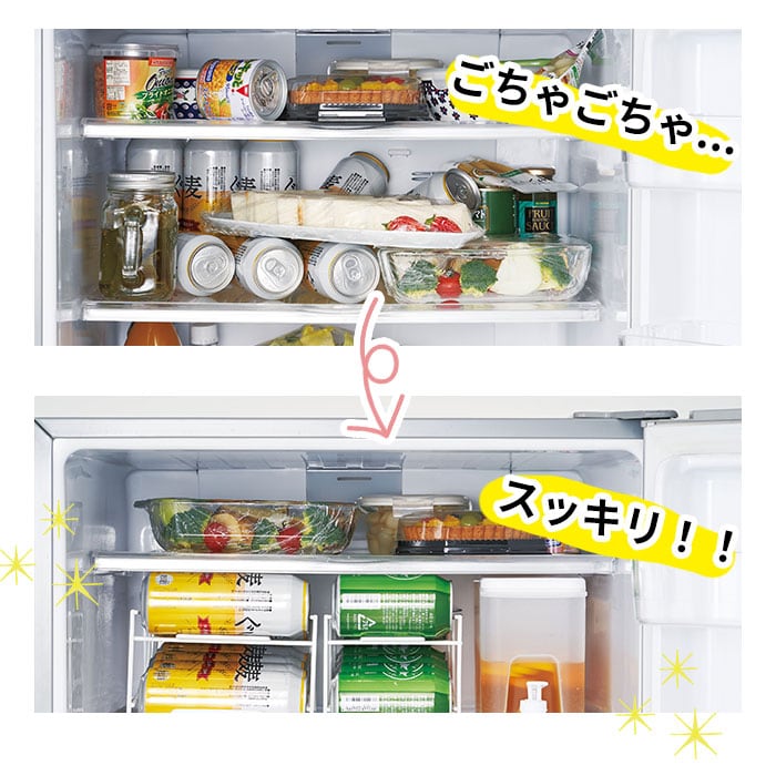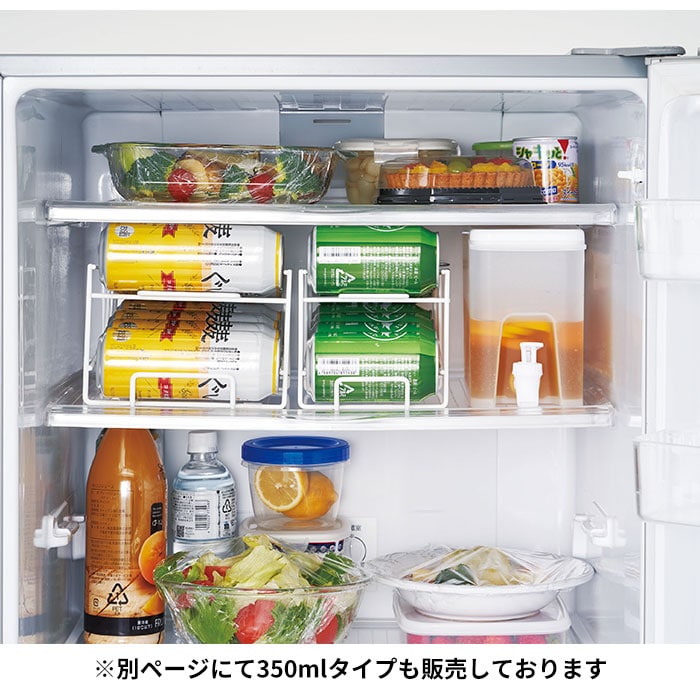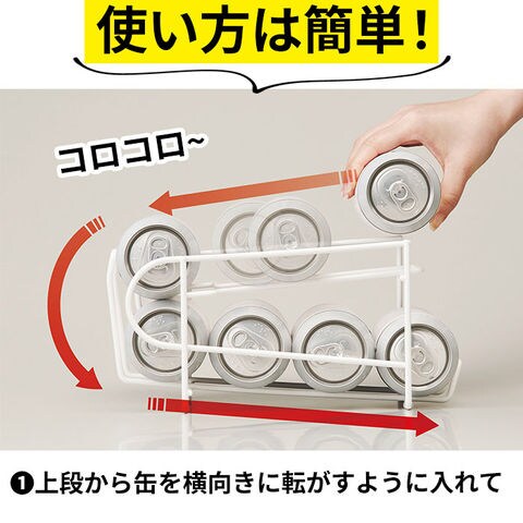 | 商品説明 | コロンと転がして簡単収納、冷えた缶からサッと取り出し!コロコロ缶配ストッカー(500mlタイプ)。ビールや清涼飲料水の500ml缶を、冷蔵庫内でスッキリ収納できるアイデアグッズ♪上段から缶を横向きに転がすように入れて、下段手前の取り出し口からスマートに取り出せるシンプル構造。高さを抑えた省スペース設計で、冷蔵庫の棚の調節が不要。食材や調味料でいっぱいになりがちな冷蔵庫内をスッキリ整頓。マットな粉体塗装を施したスチール製の丈夫なつくりに、4ヵ所の足ゴムが付いて、冷蔵庫内での滑りも防止。500ml缶を最大8缶分収納可能。(※高さ17cm程度の缶飲料が収納できます。)お風呂上りにキンキンに冷えた一杯を楽しみたいパパさんにはもちろん、学校から帰宅後にドリンクをゴクゴク飲み干したいキッズにも最適。 |