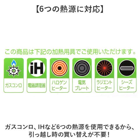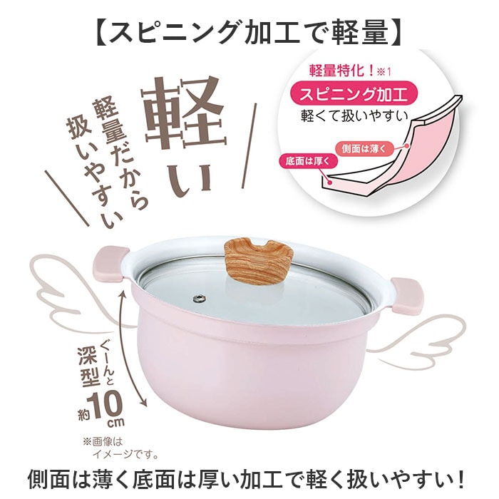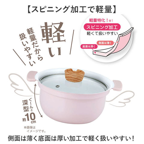 | 素材 | 【表面加工】 [内面]セラミックコーティング、[外面]焼付塗装 【材質】 [本体]アルミニウム合金 [はり底]ステンレス鋼(クロム18%) [取手カバー]シリコーン樹脂 [蓋]全面物理強化ガラス [つまみ]フェノール樹脂(木目調シリコーンコーティング) |