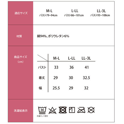 | サイズ | [レディース] ・M-Lサイズ [適応バスト]約79cm~約94cm ・L-LLサイズ [適応バスト]約86cm~約101cm ※サイズはメーカー公表サイズです。実際の商品とは多少の誤差が生じる場合がございます。あらかじめご了承ください。 |