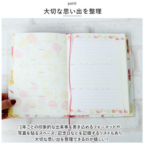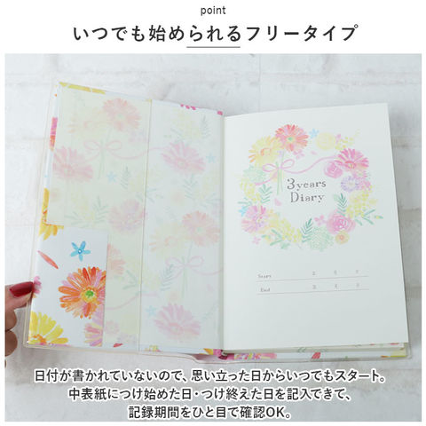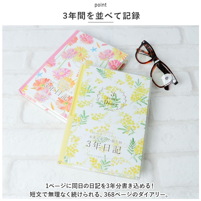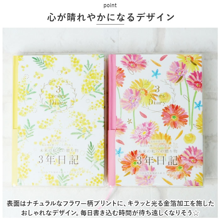 | 商品説明 | 去年の同じ日、私は何を想っていたのだろう・・・。過去の同じ日を振り返ることができる未来の私への贈り物「3年ダイアリー」が登場。【3年間を並べて記録】・1ページに同日の日記を3年分書き込める!短文で無理なく続けられる、368ページのダイアリー。【いつでも始められるフリータイプ】日付が書かれていないので、思い立った日からいつでもスタート。中表紙につけ始めた日・つけ終えた日を記入できて、記録期間をひと目で確認OK。【カバー&しおりひも付き】ダイアリーを汚れや傷から守る透明カバー。記入するページをさっと開くことができる、しおりひもも装備。【大切な思い出を整理】・1年ごとの印象的な出来事を書き込めるフォーマットや、写真を貼るスペース。記念日などを記録するリストもあり、大切な思い出を整理できるのが嬉しい!【使い方はあなた次第】ダイエットの記録、お料理レシピ、映画や読書の感想を書き留めるノートとして使ってもOK♪【心が晴れやかになるデザイン】表面はナチュラルなフラワー柄プリントに、キラッと光る金箔加工を施したおしゃれなデザイン。毎日書き込む時間が待ち遠しくなりそう☆ |