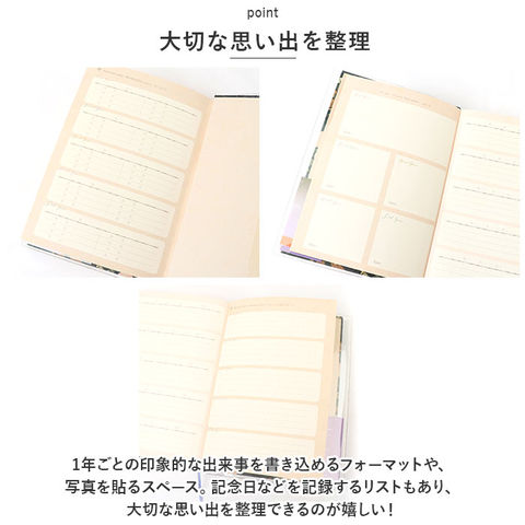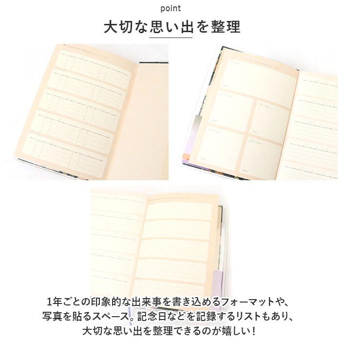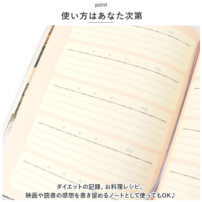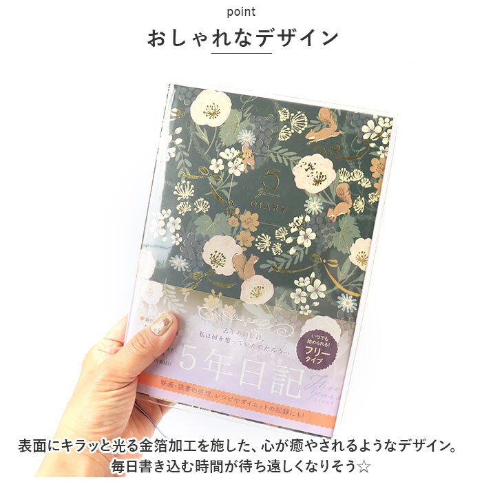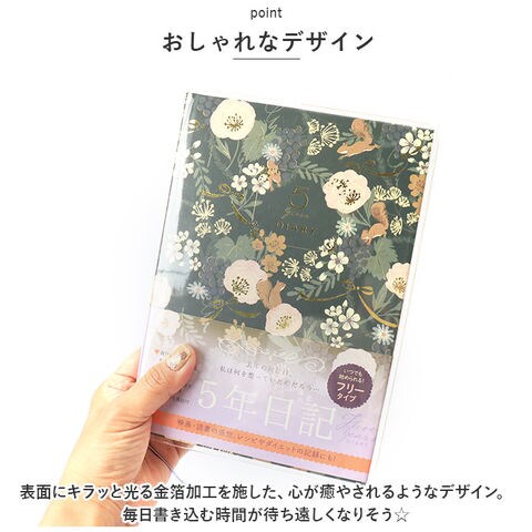 | 商品説明 | 去年の同じ日、私は何を想っていたのだろう・・・。過去の同じ日を振り返ることができる未来の私への贈り物「5年ダイアリー」が登場。【5年間を並べて記録】・1ページに同日の日記を5年分書き込める!短文で無理なく続けられる、368ページのダイアリー。【いつでも始められるフリータイプ】日付が書かれていないので、思い立った日からいつでもスタート。中表紙につけ始めた日・つけ終えた日を記入できて、記録期間をひと目で確認OK。【カバー&しおりひも付き】ダイアリーを汚れや傷から守る透明カバー。記入するページをさっと開くことができる、しおりひもも装備。【大切な思い出を整理】・1年ごとの印象的な出来事を書き込めるフォーマットや、写真を貼るスペース。記念日などを記録するリストもあり、大切な思い出を整理できるのが嬉しい!【使い方はあなた次第】ダイエットの記録、お料理レシピ、映画や読書の感想を書き留めるノートとして使ってもOK♪【おしゃれなデザイン】表面にキラッと光る金箔加工を施した、心が癒やされるようなデザイン。毎日書き込む時間が待ち遠しくなりそう☆ |