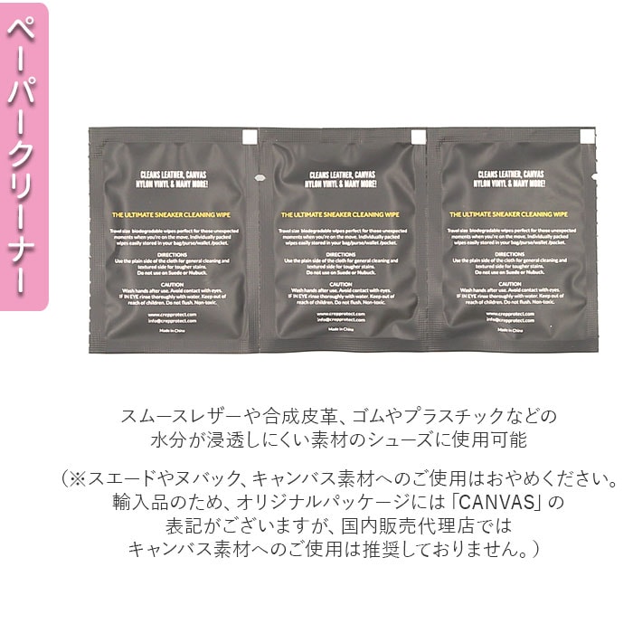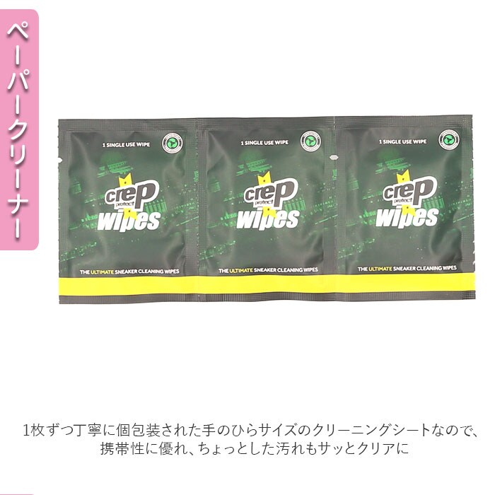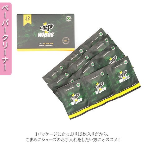 | 商品説明 | 様々なシューケアグッズで全世界を席巻している人気ブランド「Crep Protect」のシューケア3点セット。【シューケアキット】スニーカーのケアに必要なアイテムを取りそろえた、スタンダードクリーニングキット。シュークリーナー液には98%天然由来成分を使用し、どんな素材にも使用できて、しつこい汚れもしっかり落とせる。シューズ表面の汚れを優しく落とすプレミアム豚毛ブラシに、落とした汚れをサッと拭き取るマイクロファイバークロスが付属。お洒落なキャリーケース付きなので、スタイリッシュに持ち運べる♪【防水スプレー】スニーカーフリークやコレクターなど、マニアを虜にしている新感覚レジスタント・バリアー防水スプレー!優れたはっ水効果で、シューズの風合い・通気性はそのままに、水・油汚れを弾き、濡れ・ハネ・汚れからしっかりとガード!天然皮革や合成皮革、スエード、ヌバック、キャンバス素材、ナイロン等シューズに使用されている素材に対応可能。(※爬虫類の皮革、ガラス系、エナメル、ワックスやポリウレタン及びビニールコーティング加工が施された繊維・革製品にはご使用いただけません。)【ペーパークリーナー】お気に入りの靴がいつでもどこでも手軽にお手入れができるペーパークリーナー。1枚ずつ丁寧に個包装された手のひらサイズのクリーニングシートなので、携帯性に優れ、ちょっとした汚れもサッとクリアに。スムースレザーや合成皮革、ゴムやプラスチックなどの水分が浸透しにくい素材のシューズに使用可能。(※スエードやヌバック、キャンバス素材へのご使用はおやめください。輸入品のため、オリジナルパッケージには「CANVAS」の表記がございますが、国内販売代理店ではキャンバス素材へのご使用は推奨しておりません。)シートの表面は、汚れの程度に応じて使い分けのできるリバーシブル仕様。表側の平らな面は、シューズ全体の汚れ落としに。裏側の凹凸面はミッドソールの泥汚れなど、しつこい汚れをOFFするのに最適。1パッケージにたっぷり12枚入りだから、こまめにシューズのお手入れをしたい方にオススメ!「Crep Protect Wipes」のロゴがお洒落な缶ケース付き。 |
