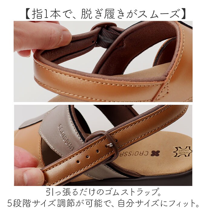 | 商品説明 | 【素足がよろこぶ、心地よさ♪】生活のあらゆるシーンに、快適なスタイルを提案!「クロワッサン レディースサンダル」。【履くほどクセになる柔らかさ】足に触れる部分は全てふんわり。マシュマロに包み込まれるような、軽い履き心地がポイント♪【足裏に馴染むフットベッド】足裏の形状に合わせたフットベッド。しっとりとした肌触りで、素足でも疲れにくい◎【ソフトなストレッチ生地が嬉しい】裏地はサラッとソフトな、ストレッチ生地。足に食い込むことなく、優しくサポート。【指1本で、脱ぎ履きがスムーズ】引っ張るだけのゴムストラップ。5段階サイズ調節が可能で、自分サイズにフィット。【軽やかで歩きやすさが向上】足に負担をかけない柔らかソール。程よい屈曲性があり、足取りも軽快!【年代問わず、おしゃれに履ける☆】アッパーに本革を使い、落ち着きのある風合いに仕上げた日本製。切り替えの配色がアクセント。 |