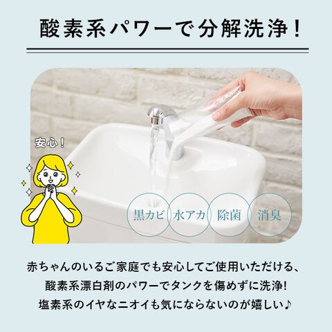 | 注意点 | 用途以外に使用しないでください。荒れ性の方は炊事用手袋を使用してください。他の洗浄剤と混ぜて使用しないでください。子供の手の届くところに置かないでください。直射日光のあたる場所、高温多湿になる場所には置かないでください。50度以上のお湯で使用しないでください。衣類などに付着すると脱色することがあります。使用の際は粉末や溶かした液が目や体にかからないように注意してください。トイレタンクから直接給水するタイプのおしり洗浄機能付きタンクには使用できません。[応急処置]粉や溶かした液が目に入った場合はすぐに流水で洗い流してください。万一飲み込んだ場合は、吐かせずに口をよく洗い、水や牛乳を飲ませてください。皮膚についた場合は流水でよく洗い流してください。異常が残る場合は、処置をしたうえ、本品を持参して医師に相談してください。カメラやモニターの性質により、画像と実物の色の違いがある場合がございますのでご理解願います。 |