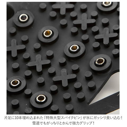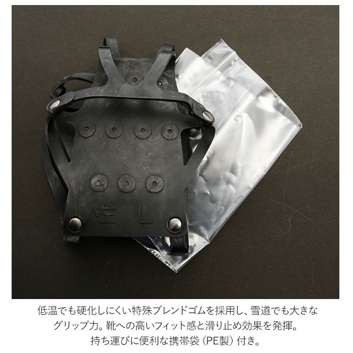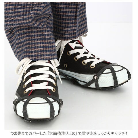 | 商品説明 | 簡単に脱着出来て、旅行通勤時の突然の降雪でも快適歩行!雪道用滑り止めコロバンド。片足に10本埋め込まれた「特殊大型スパイクピン」が氷にガッシリ食い込む!雪道でもがっちりとかんで強力グリップ!つま先までカバーした「大面積滑り止め」で雪や氷をしっかりキャッチ!接地面積を大きくすることでつるつる路面での蹴り出し時も安心。低温でも硬化しにくい特殊ブレンドゴムを採用し、雪道でも大きなグリップ力。その弾力性で靴への高いフィット感と滑り止め効果を発揮。雪をつかむ特殊カットの「3方向立体ブロック」でどの方向へも滑り止め効果を発揮。輪の中につま先を入れて、かかとにバンドを掛けるだけのワンタッチ装着!寒い戸外、かじかんだ手でも靴への装着がラクラクできる!つま先が締め付けられない特殊な立体形状と、伸縮性の高いゴムで長時間の歩行でも疲れにくい足にやさしい設計。Lサイズ(約24.5cm~28.5cm)、Mサイズ(約21.0cm~24.0cm)。持ち運びに便利な携帯袋(PE製)付き。 |