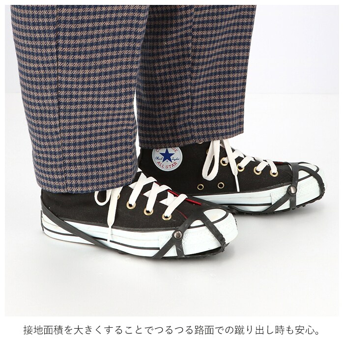 | 注意点 | 靴のサイズに合わない場合は、靴から外れたり足に負担が掛かるので使用しないでください。不完全な取り付けの状態やスパイク面以外(裏面)を使用しての歩行は危険ですのでおやめください。スパイクは硬い金属です。直接手や指で触ると傷つけることがあり危険ですので触れないで下さい。コロバンドを取り付けた状態で走ったり、車の運転は危険ですのでおやめください。マンホール、タイル、コンクリート、アスファルト等の硬い路面ではスパイクで滑るのでその上を歩行しないでください。また室内では、じゅうたん、Pタイル、木製床などでつまずいたり、滑ったり、キズ付けたりして危険ですので使用しないで下さい。白及びうす色の靴に装着するとゴムの色が付着します。ご使用にならないで下さい。長時間靴に装着しているとゴムの色が靴に移ったり、跡がついたりすることがあります。歩行後は靴から外してください。コロバンドは安全歩行を保障するものではありません。転倒しないように十分気をつけて歩行してください。ゴムの劣化防止のため乾燥後、日の当たらない常温で保管してください。付属の携帯袋はPE製のチャック付きビニール袋です。カメラやモニターの性質により、画像と実物の色の違いがある場合がございますのでご理解願います。 |