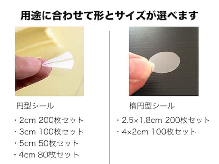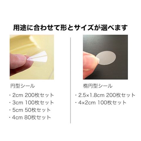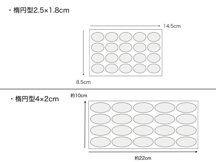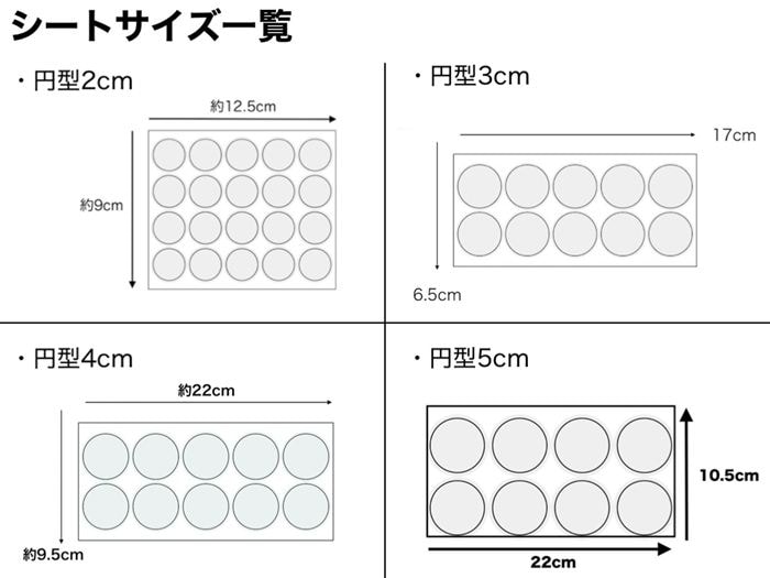 | サイズ | 円型:2cm・200枚 円型:3cm・100枚 円型:4cm・80枚 円型:5cm・50枚 楕円:2.5cm×1.8cm・200枚 楕円:4cm×2cm・100枚 |