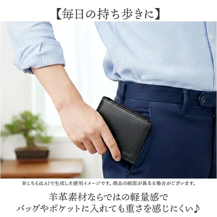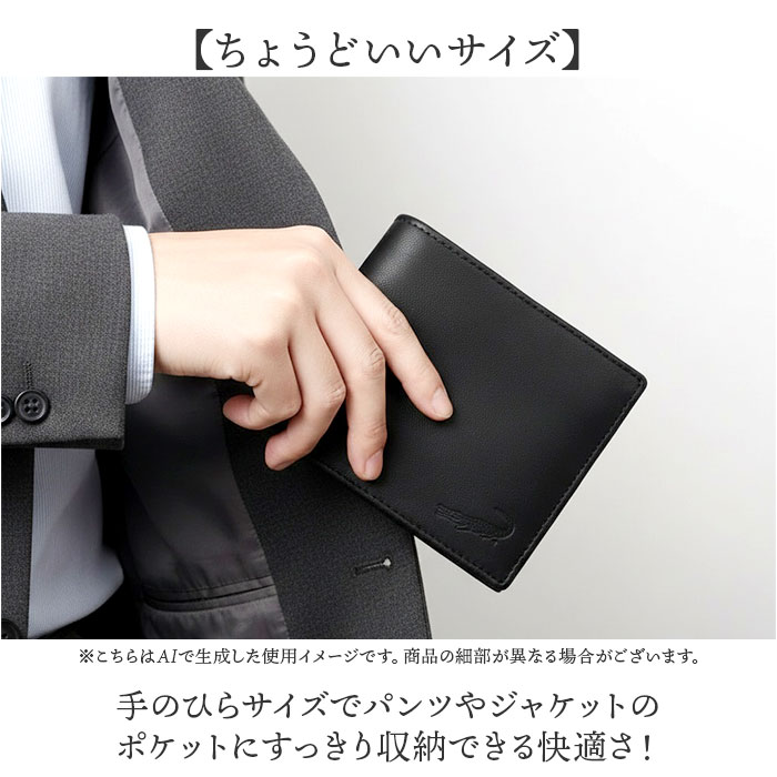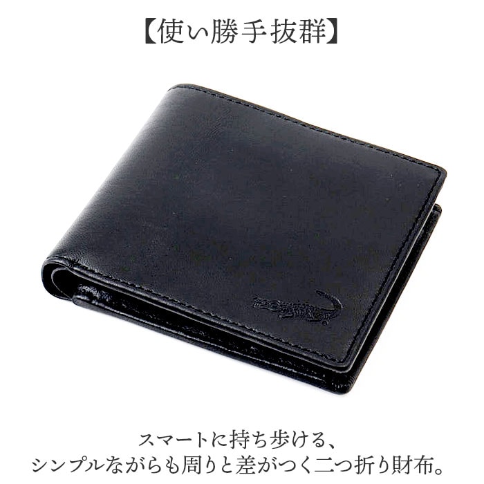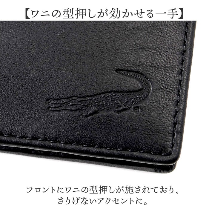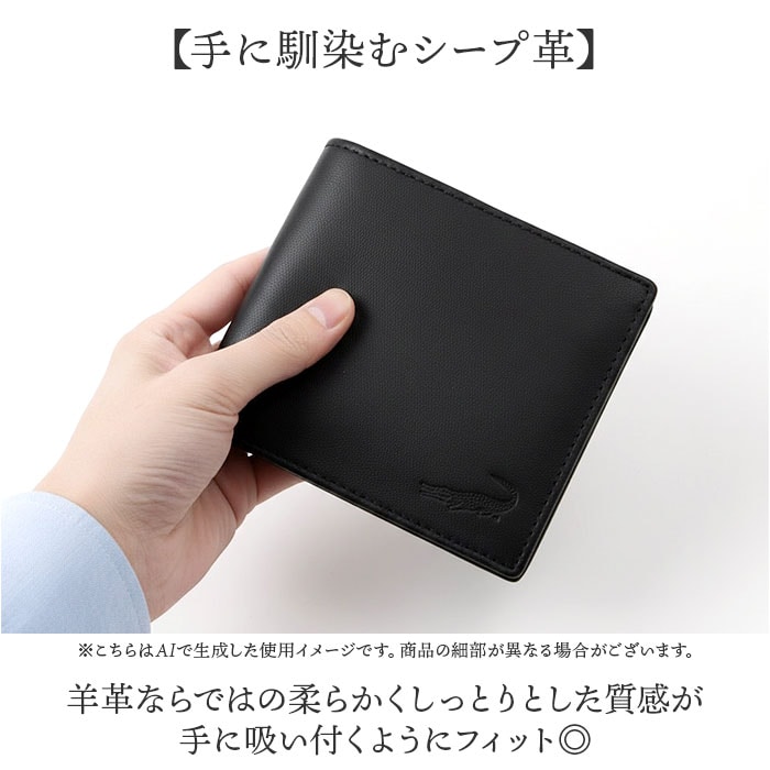 商品説明【使い勝手抜群】スマートに持ち歩ける、シンプルながらも周りと差がつく二つ折り財布。【ワニの型押しが効かせる一手】フロントにワニの型押しが施されており、さりげないアクセントに。【すっきり収納】内側には仕切り付きのお札入れとカード入れ、マチ付きの小銭入れを配置〇【ちょうどいいサイズ】手のひらサイズでパンツやジャケットのポケットにすっきり収納できる快適さ!【手に馴染むシープ革】羊革ならではの柔らかくしっとりとした質感が手に吸い付くようにフィットする上質な触り心地◎【毎日の持ち歩きに】羊革素材ならではの軽量感でバッグやポケットに入れても重さを感じにくい♪