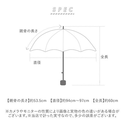 | サイズ | [親骨の長さ]約53.5cm/[直径]約94cm/[全長]約60cm [収納時の長さ]約28cm [収納時の幅]約6cm ※サイズは当店計測の実寸サイズです。実際の商品ならびにメーカー表記サイズとは多少の誤差が生じる場合がございます。あらかじめご了承ください。 |