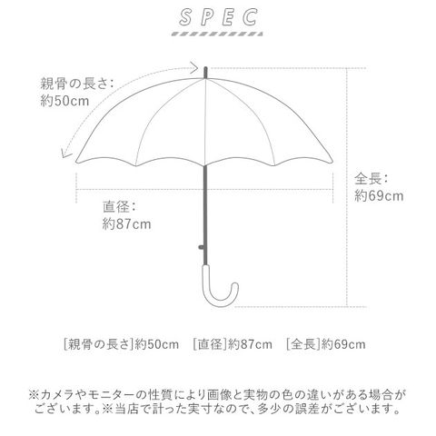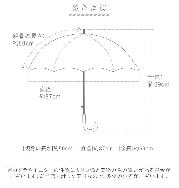 | サイズ | [親骨の長さ]約50cm [直径]約87cm [全長]約69cm [持ち手]約13.5cm ※サイズは当店平置き実寸サイズです。実際の商品とは多少の誤差が生じる場合がございます。あらかじめご了承ください。 |