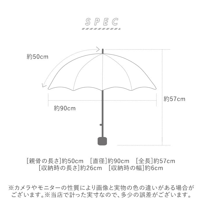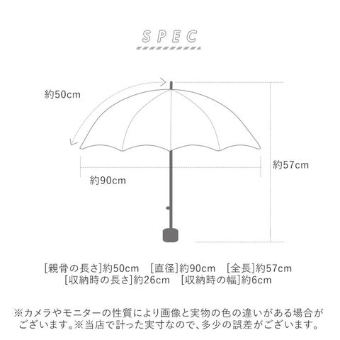 | サイズ | [親骨の長さ]約50cm [直径]約90cm [全長]約57cm [収納時の長さ]約26cm [収納時の幅]約6cm ※サイズは当店平置き実寸サイズです。実際の商品とは多少の誤差が生じる場合がございます。あらかじめご了承ください。 |