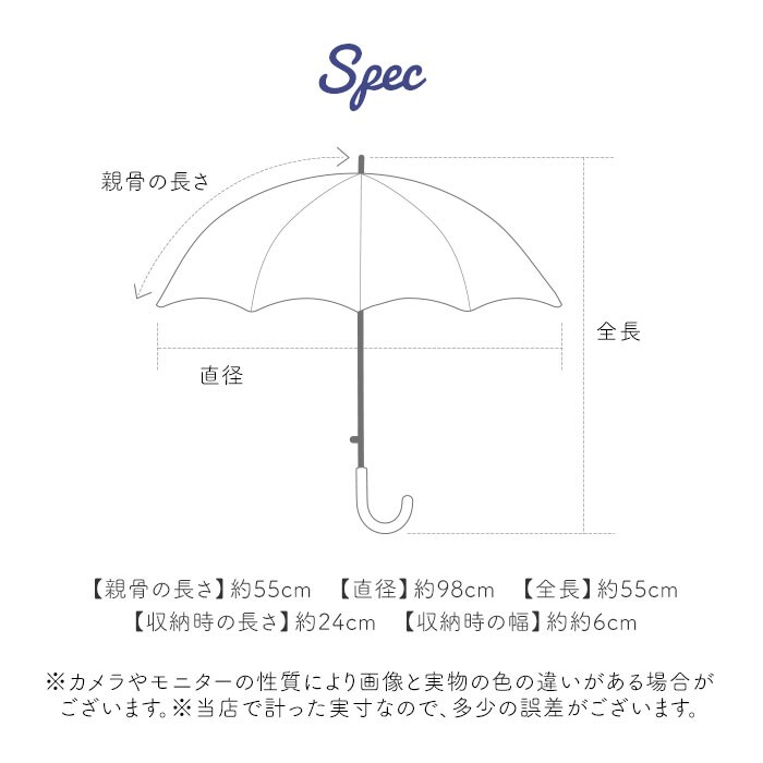 | サイズ | [親骨の長さ]約55cm/[直径]約98cm/[全長]約55cm [収納時の長さ]約24cm [収納時の幅]約6cm ※サイズは当店計測の実寸サイズです。実際の商品ならびにメーカー表記サイズとは多少の誤差が生じる場合がございます。あらかじめご了承ください。 |