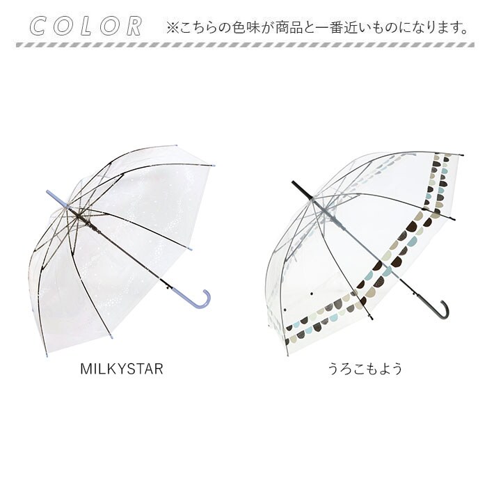 | 商品説明 | クリア仕様の可愛らしいデザイン♪カラーグラスファイバーを用いた、おしゃれなアンブレラ「POE」が発売。(親骨60cm)軽量で弾力性に優れたグラスファイバーのカラー骨を採用しているので、風でしなっても折れにくく見た目もキュート♪丈夫な8本骨仕様で、親骨60cmと大きめサイズ。強い雨や風から身を守ってくれる。ワンタッチで開くジャンプ傘だから、荷物が多い時も片手でスムーズに開閉できちゃう◎傘生地には透明なポリエチレン素材を使用。星柄や光沢のあるオーロラなど、憂鬱な雨の日も楽しい気分になれるデザインをラインナップ。ちょっと特別なビニール傘でまわりと差をつけて♪ |