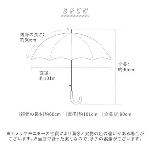 | サイズ | [親骨の長さ]約60cm/[直径]約101cm/[全長]約90cm ※サイズは当店計測の実寸サイズです。実際の商品ならびにメーカー表記サイズとは多少の誤差が生じる場合がございます。あらかじめご了承ください。 |