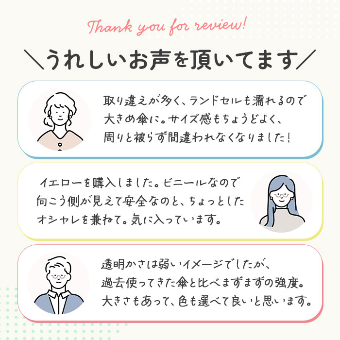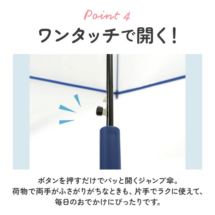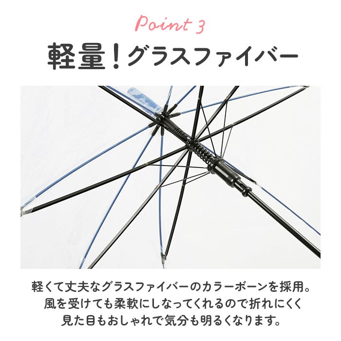 | 商品説明 | 今流行のクリア仕様!カラーグラスファイバーを用いたお洒落なアンブレラ「POE」が新登場。軽量で弾力性に優れたグラスファイバーのカラー骨を採用しているので、風でしなっても折れにくく見た目もキュート!しかもしっかり丈夫な8本骨で、親骨60cmと大きめサイズ。強い雨や風から身を守ってくれる。またワンタッチで開くジャンプ傘だから、荷物が多い時も片手でスムーズに開くことが可能。傘生地には透明なポリエチレン素材を使い、裾部分を持ち手や骨と同色のバイアスでトリミングしたこだわりのデザイン!持ち手もマットな仕上げで高級感のある雰囲気に。ちょっと特別なビニール傘でまわりと差をつけて♪ |
