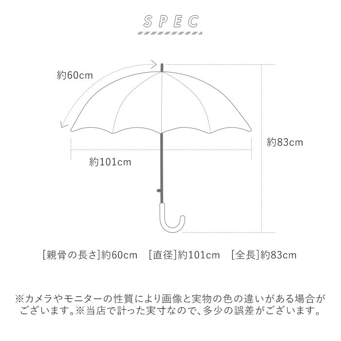 | サイズ | [親骨の長さ]約60cm/[直径]約101cm/[全長]約83cm ※サイズは当店平置き実寸サイズです。実際の商品ならびにメーカー表記サイズとは多少の誤差が生じる場合がございます。あらかじめご了承ください。 |