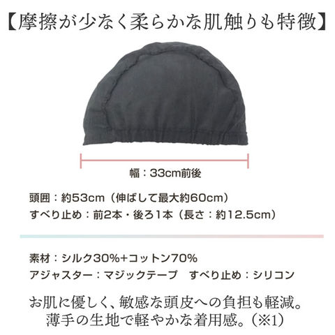 | 商品説明 | 【ウィッグ着用時の心強い相棒】自毛がすっきりまとまり、付け心地も抜群!「プリシラ コットンシルク インナーキャップ」。【自分サイズに心地よくフィット】面ファスナー式のアジャスターで、簡単サイズ調節。留め具不使用で、ストレスフリー。【ズレにくく安定した状態をキープ】キャップの前後には、滑り止めテープを装備。ズレが気になりにくく、長時間の着用も安心◎【お好みで折り曲げてアレンジOK】滑り止めテープが不要な場合は、折り曲げて使うことも可能。シリコンのオン・オフを調整。【シルクブレンドで快適にサポート】コットンにシルクを配合。保温性・吸湿性に優れ、夏はサラッと涼しく冬はあたたかい♪【摩擦が少なく柔らかな肌触りも特徴】お肌に優しく、敏感な頭皮への負担も軽減。薄手の生地で軽やかな着用感。(※1)シルクは弱酸性のアミノ酸タンパク質でできている繊維です。静菌作用もあり、敏感肌の方におすすめです。【自宅で手洗いできて衛生的】汗や汚れが気になったら、優しく手洗い。いつも清潔に保てるのが嬉しい♪(※2)漂白剤は厳禁です。中性洗剤またはシルク専用の洗剤を使用してください。 |