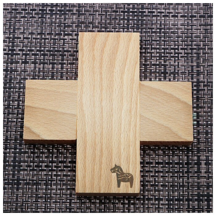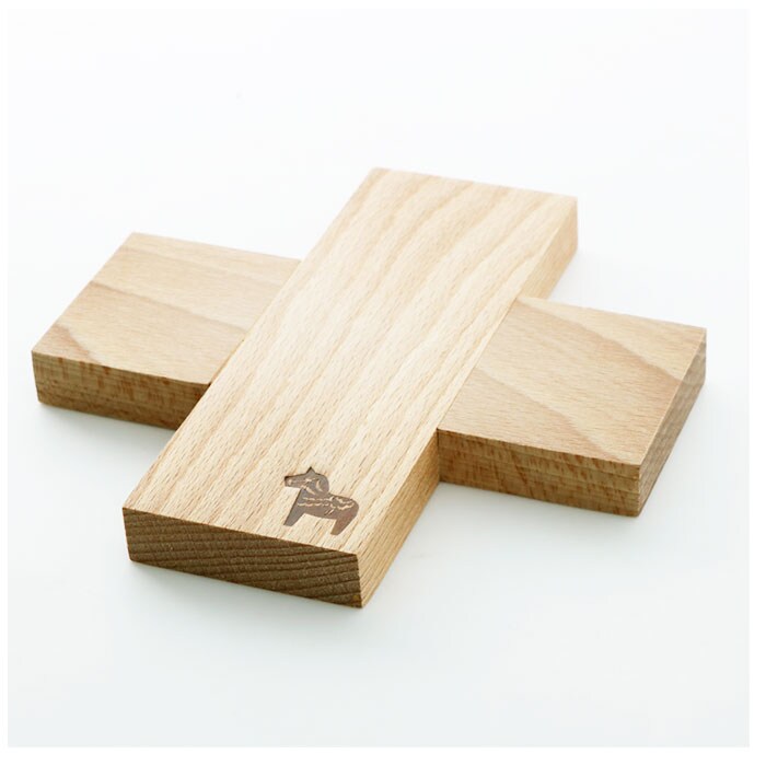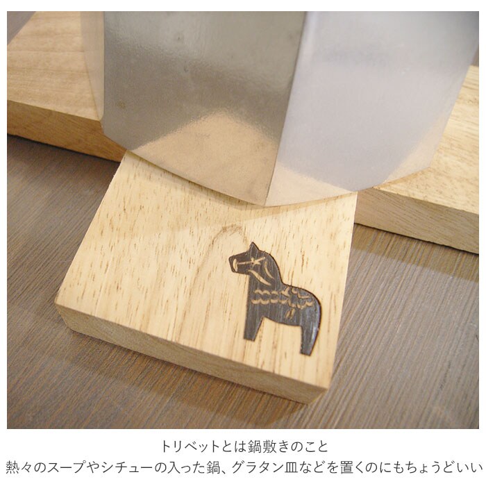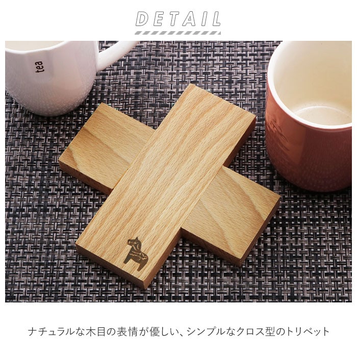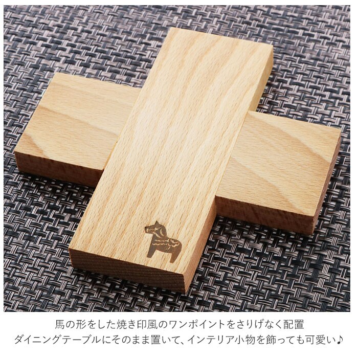 | 商品説明 | ナチュラルな木目の表情が優しい、シンプルなクロス型のトリベット。トリベットとは鍋敷きのこと。熱々のスープやシチューの入った鍋、グラタン皿などを置くのにもちょうどいい。ひとつひとつ表情の異なるブナ材を使用。使い込むほどに素材の色合いが深みを増して、木の温もりが感じられるのも魅力。小ぶりなサイズ感なので、鍋敷きとしてだけでなくコーヒーポットやティーポットなどを置けば、おもてなし用にも大活躍。馬を象った焼き印風のワンポイントをさりげなく配置。ダイニングテーブルにそのまま置いて、インテリア小物を飾っても可愛い♪ |