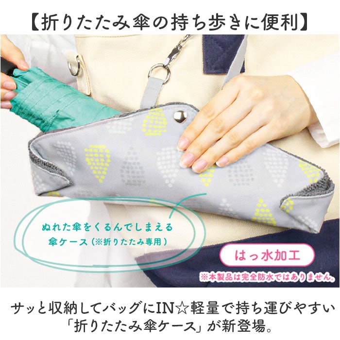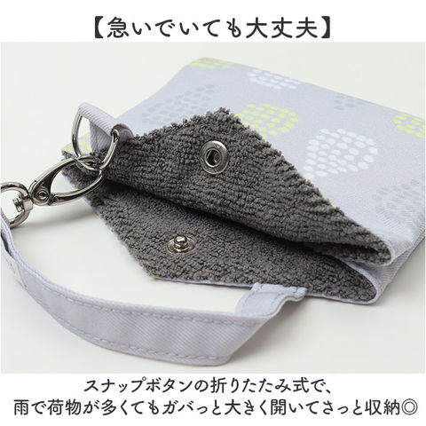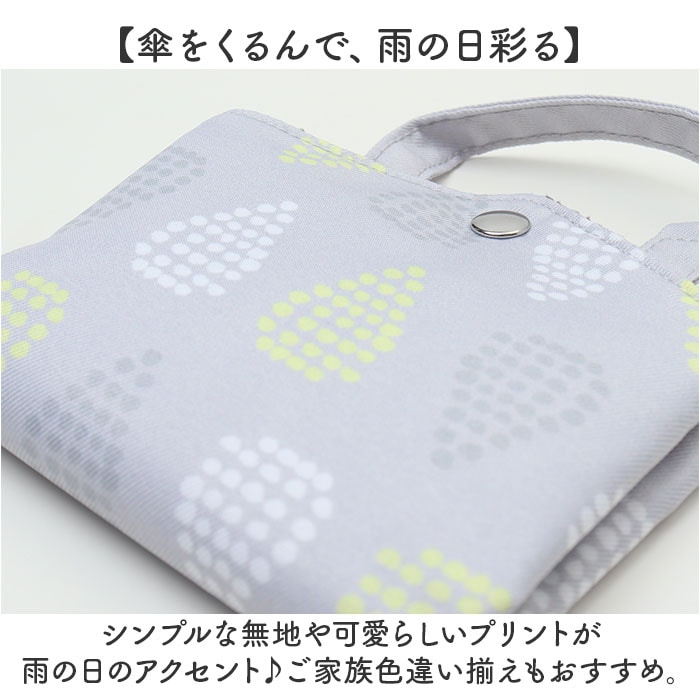 | 商品説明 | 【折りたたみ傘の持ち歩きに便利】サッと収納してバッグにIN☆軽量で持ち運びやすい「折りたたみ傘ケース」が新登場。【使わない時もノンストレス】使わない時はコンパクトに折りたたんで、バッグに掛ければかさばらず持ち歩ける。【急いでいても大丈夫】スナップボタンの折りたたみ式で、雨で荷物が多くてもガバっと大きく開いてさっと収納◎【一般的な折りたたみ傘に対応】お手持ちの折りたたみ傘にフィットするサイズ感。すっきりまとまるので、旅行などのお供にも。※折り畳み傘適応サイズ(折りたたみ時):全長26cm、周囲19cm以下。※傘の形状やサイズによっては、ご使用になれない場合があります。【ちょっとの雨なら大丈夫】汚れや水滴を弾きやすい、はっ水加工済み。お手入れも拭き取るだけ。※完全防水ではありません。濡れた場合はすぐに拭き取ってください。※内側はタオル地のような素材ですが、吸水力はありません。【付属のケースを紛失しても大丈夫】なくしがちな傘ケース…。そんな時もこれさえあれば、問題なく使えるのが嬉しい!【傘をくるんで、雨の日彩る】シンプルな無地や可愛らしいプリントが雨の日のアクセント♪ご家族色違い揃えもおすすめ。 |