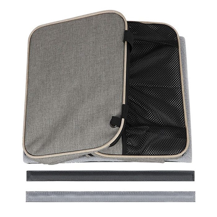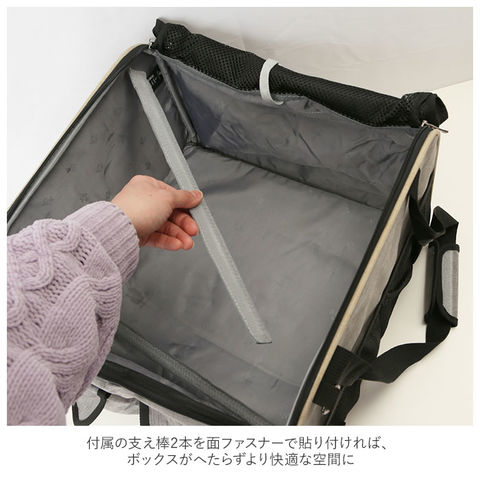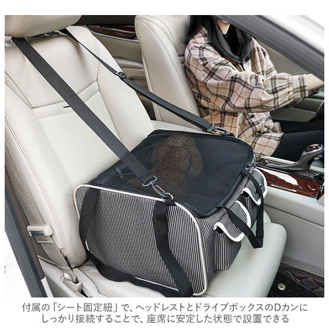 | 商品説明 | 車での移動中も、ゆったりサイズでワンちゃん快適!大人気ペットグッズに、「ペット用ドライブボックス」が仲間入り。付属の「シート固定紐」を使用し、ヘッドレストとドライブボックスのDカンにしっかり接続することで、座席に安定した状態で設置できるからとっても安全!ワンちゃんの首輪に繋ぐことのできる「飛び出し防止リード」付きなので、飼い主さんは運転に集中◎元気なワンちゃんが動きまわっても大丈夫!さらにボックス天井部分は、コの字型ファスナーで大きく開くメッシュ屋根付き。屋根を開放しておくときは、ゴムバンドでヘッドレストに固定するか、くるくると丸めて面ファスナーで留めておくことも可能。通常のペットキャリーに比べ、ワンちゃんが快適に寝そべることのできる広々設計。付属の支え棒2本を面ファスナーで貼り付ければ、ボックスがへたらずより快適な空間に。ボックス前面のマチ付きポケット×2、側面のメッシュポケット×2に、ペットシーツやマナーウェア、おやつ用のフードなどを入れておくと便利。底面クッションパッドは、内側のクッション材と中板を外せば、お洗濯もできて、いつでも清潔!持ち手ハンドル付きなので、動物病院への通院やお出かけ時にはペットキャリーにもなる2WAY仕様!使用しないときは折りたたんで厚みを抑えればとってもコンパクトサイズに!場所をとらず、ちょっとした隙間にも収納できるのが嬉しいポイント。 |