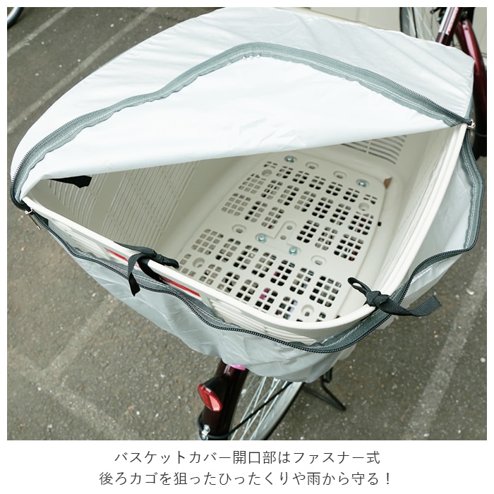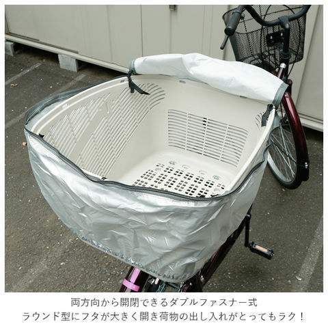 | 商品説明 | 急に雨に降られても大丈夫!カゴに入れた大切な荷物を守ってくれる、自転車後カゴ用バスケットカバー♪バスケットカバー開口部はしっかりファスナー式で、大切な荷物を後ろカゴを狙ったひったくりや雨から守る!女性やお年を召した方も安心♪表面生地にはシルバーコーティングにはっ水加工を施したポリエステル生地を使用。突然雨に降られた時も、荷物が雨に濡れるのを防ぎ、帰宅後にサッと拭くだけでお手入れも簡単。取り付け方法はカンタン!バスケットカバーを後ろカゴバスケットにすっぽりと被せて、6ヶ所のヒモを結ぶだけ!しっかり固定できる♪両方向から開閉できるダブルファスナー式で、ラウンド型にフタが大きく開くので、荷物の出し入れがとってもラク!お買い物をした食材や、荷物のさりげない目隠しにもなって便利。 |