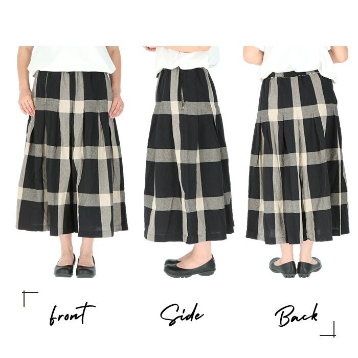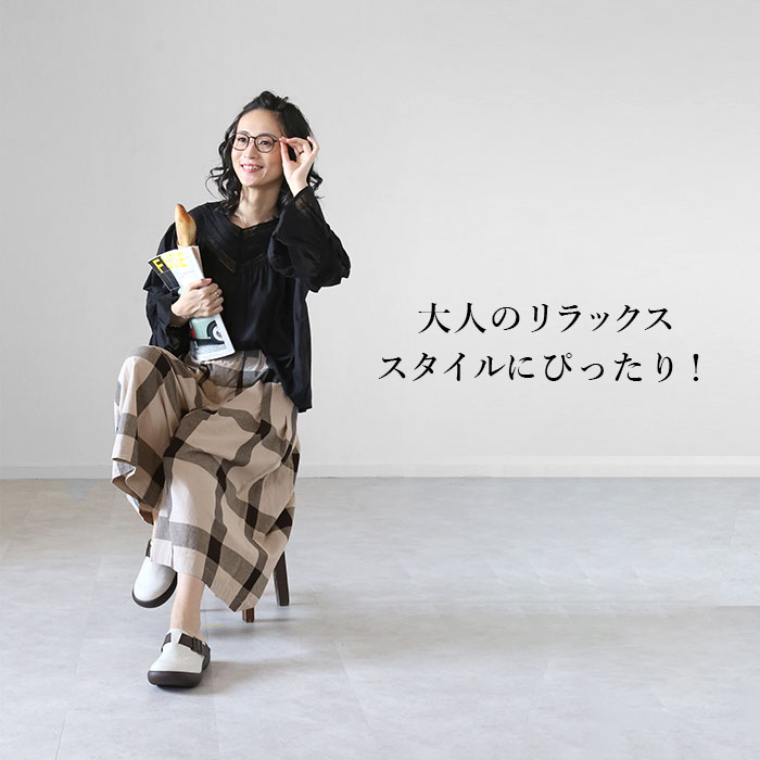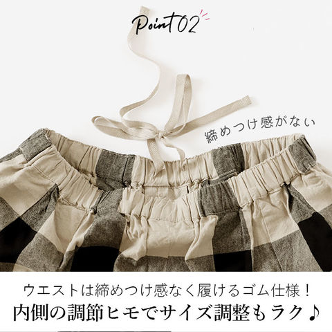 | 商品説明 | まるでスカートを思わせるような、ゆったりシルエット♪チェックガウチョパンツが発売。優しい肌触りのコットン100%素材を使用。ウエストは締めつけ感なく履ける総ゴム仕様。内側の調節紐でサイズ調整もラクラク。両サイドに便利なポケット付き。甘さをおさえたデザインと落ち着いたカラーの配色がポイント♪大人のリラックススタイルにぴったり! |