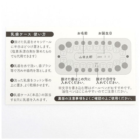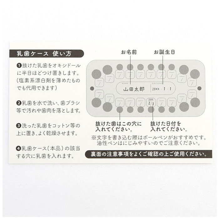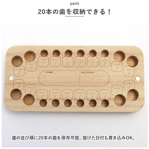商品説明お子さまの成長の証を保管できる♪キャラクターデザインの乳歯ケースが登場。【ワンタッチ着脱】フタは着脱が簡単なマグネットタイプ。ピタッと密着し、万が一ケースを落としてしまっても大切な乳歯がバラバラにならず安心◎【オリジナル仕様にできるケース】ケース中央にお子さまの名前と誕生日を書き込める♪フタをしても書き込み部分が見えるつくり。(※フタの中央のみクリア仕様になっております。)【20本の歯を収納できる!】歯の並び順に20本の歯を保存可能。抜けた日付も書き込みOK。【可愛らしいキャラクターデザイン】ナチュラルな質感の桐箱に、キャラクター柄がプリントされたアクリル製のフタをプラス。置いておくだけでも可愛いデザイン☆安心の日本製。
