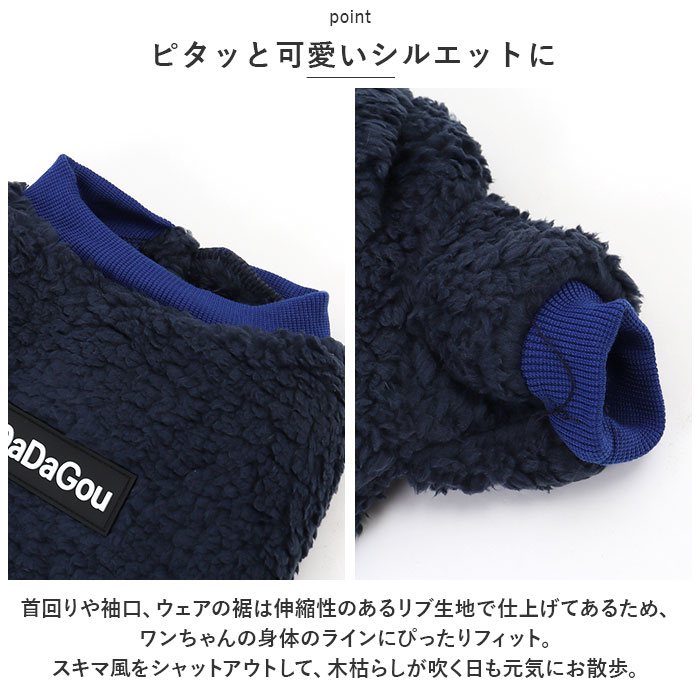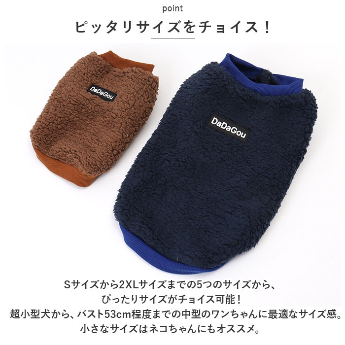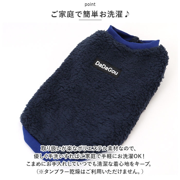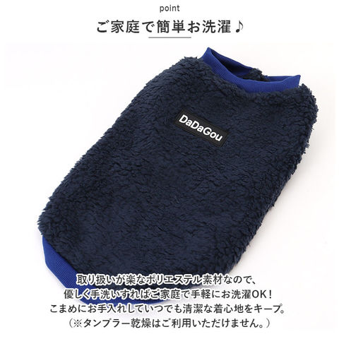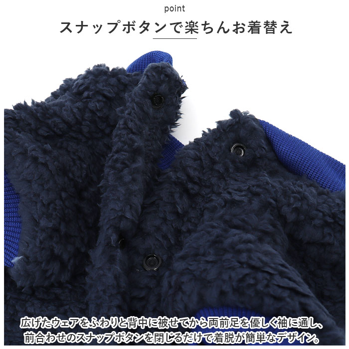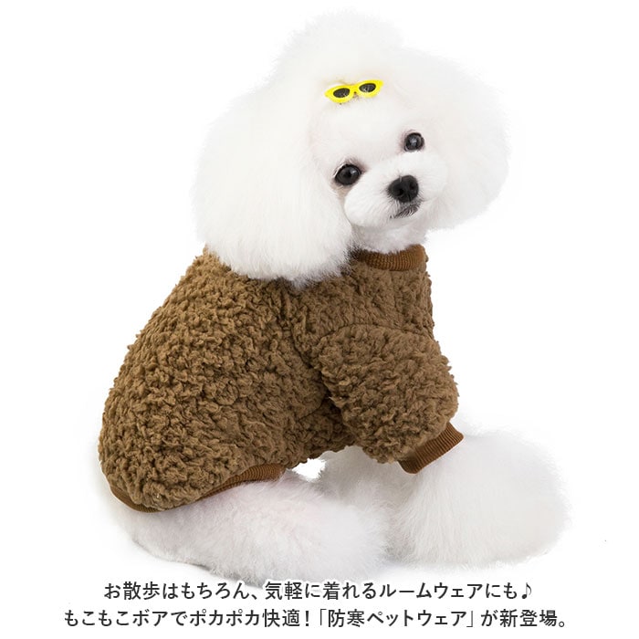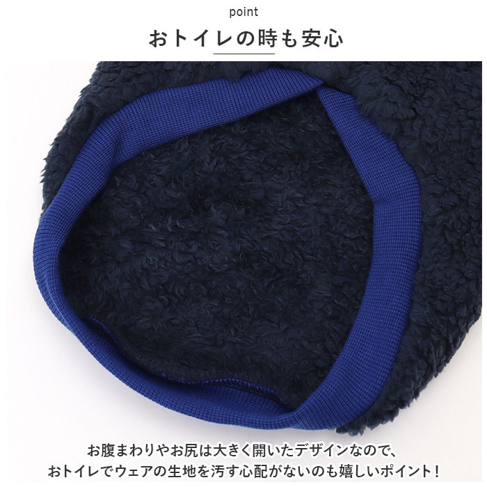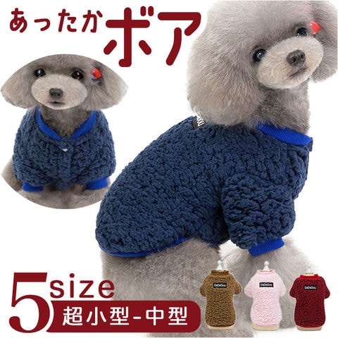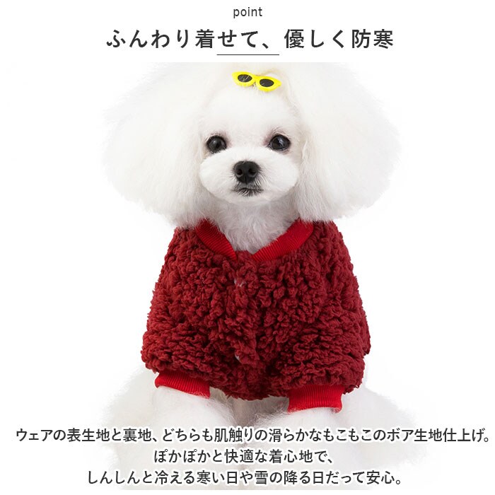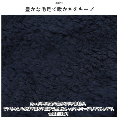 | 商品説明 | お散歩はもちろん、気軽に着れるルームウェアにも♪もこもこボアでポカポカ快適!「防寒ペットウェア」が新登場。【ふんわり着せて、優しく防寒】ウェアの表生地と裏地、どちらも肌触りの滑らかなもこもこのボア生地仕上げ。ぽかぽかと快適な着心地で、しんしんと冷える寒い日や雪の降る日だって安心。【豊かな毛足で暖かさをキープ】たっぷりと毛足の豊かなボア素材が、ワンちゃんの身体の周りの暖かな空気をしっかりとキープしてくれるので、保温性抜群!【スナップボタンで楽ちんお着替え】広げたウェアをふわりと背中に被せてから両前足を優しく袖に通し、前合わせのスナップボタンを閉じるだけで着脱が簡単なデザイン。【ピタッと可愛いシルエットに】首回りや袖口、ウェアの裾は伸縮性のあるリブ生地で仕上げてあるため、ワンちゃんの身体のラインにぴったりフィット。スキマ風をシャットアウトして、木枯らしが吹く日も元気にお散歩。【おトイレの時も安心】お腹まわりやお尻は大きく開いたデザインなので、おトイレでウェアの生地を汚す心配がないのも嬉しいポイント!【ご家庭で簡単お洗濯♪】取り扱いが楽なポリエステル素材なので、優しく手洗いすればご家庭で手軽にお洗濯OK!こまめにお手入れしていつでも清潔な着心地をキープ。(※タンブラー乾燥はご利用いただけません。)【ピッタリサイズをチョイス!】Sサイズから2XLサイズまでの5つのサイズから、ぴったりサイズがチョイス可能!超小型犬から、バスト53cm程度までの中型のワンちゃんに最適なサイズ感。小さなサイズはネコちゃんにもオススメ。【暖かなお部屋に馴染むカラー】バラエティに富んだカラーと、温かみのあるボアの素材感が飼い主さんの秋冬ファッションに素敵にシンクロ。背中のブラックのラバーネームがさりげないワンポイント。 |