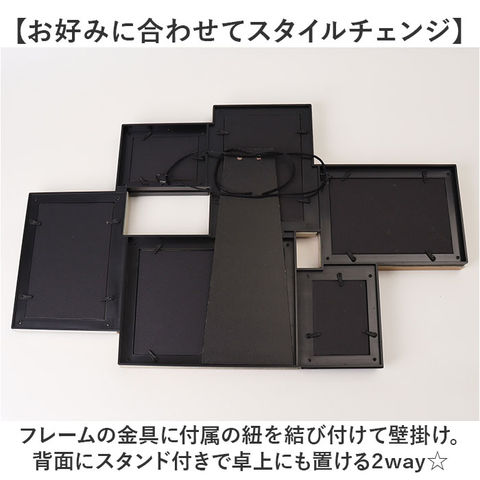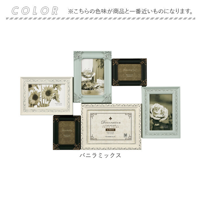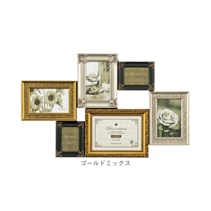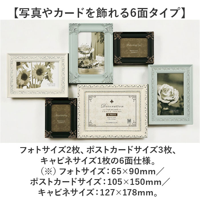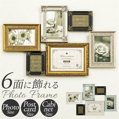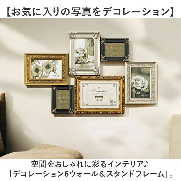 | 商品説明 | 【お気に入りの写真をデコレーション】空間をおしゃれに彩るインテリア♪「デコレーション6ウォール&スタンドフレーム」。【写真やカードを飾れる6面タイプ】フォトサイズ2枚、ポストカードサイズ3枚、キャビネサイズ1枚の6面仕様。(※)フォトサイズ:65×90mm/ポストカードサイズ:105×150mm/キャビネサイズ:127×178mm。【お好みに合わせてスタイルチェンジ】フレームの金具に付属の紐を結び付けて壁掛け。背面にスタンド付きで卓上にも置ける2way☆【アンティーク感漂うデザインも魅力】存在感のある大きめサイズ。こなれた雰囲気を演出する、モダンなアンティーク調フレーム。【お祝いのギフトにもおすすめ】新築・結婚・出産などのプレゼントに♪思い出の写真や、好きなアート作品のカードを飾れる! |