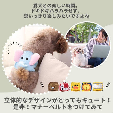 | 商品説明 | 道行く人がみんな笑顔になる、キュートなアニマルデザイン♪愛犬とのお出掛けに便利な「ペット用アニマルマナーパンツ×2枚セット」が新登場。【汗ばむ季節もサラッと快適】表生地には、ふんわり柔らかく吸湿性に優れたコットン混紡素材を使用。サラッと肌触りがよく、お散歩大好き、運動量の多いワンちゃんに最適。【ムレにくいメッシュ素材】内側は目の細かいメッシュ状の生地を使用しているので、デリケートなお腹のお肌に優しく、通気性もばっちり。【クルっと巻いて、装着スムーズ!】ワンちゃんの腰部分にクルッと巻き付けて、面ファスナーで留めるだけのカンタン装着!面ファスナーを広い範囲に配置することで、サイズ調節も自在。【マナーウェアをピタッと固定】クロッチ部脇の左右2箇所に、使い捨てタイプのマナーウェアを装着できるゴムバンド付き。ワンちゃんが活発に動いてもズレにくく安心。【ご家庭でカンタンお洗濯♪】お手入れのしやすいコットン混紡素材だから、ご家庭でお洗濯OK!いつでも清潔で気持ちのよい使い心地。【ぴったりサイズをチョイス!】S・M・L・XLサイズまでの4サイズ展開で、小型犬から中型犬までぴったりサイズがチョイス可能♪【アニマルに変身してお出掛け!】ぴょこんと可愛いお耳は立体的に、つぶらな瞳やお鼻は刺繍やボタンで表現したアニマルデザインをはじめ、カジュアルに着こなせるプレッピースタイルなど、バラエティに富んだカラーラインナップ。飼い主さんとのお出掛けは、キュートで個性的なスタイルに変身!(※一部アニマルデザインではないカラーもございます。) |
