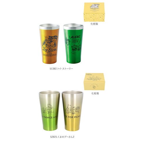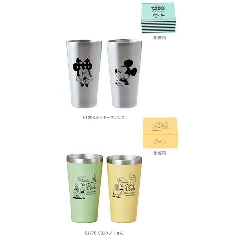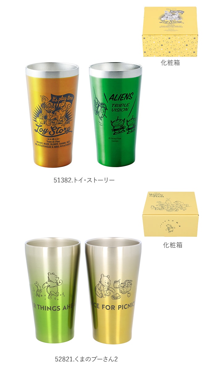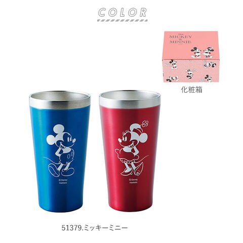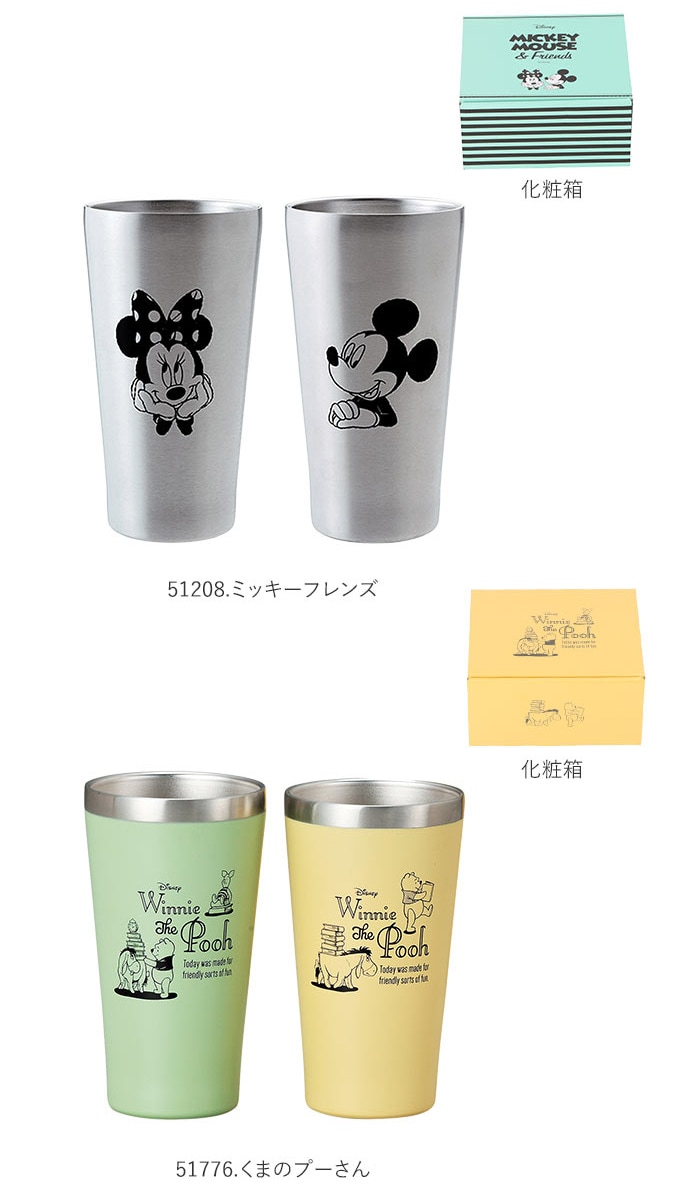 | 商品説明 | 魅力的なディズニーのキャラクターがデザインされたメタルサーモタンブラーペアセット本体内側と外側が真空断熱されたステンレス二重構造タイプで、熱が伝わりにくいため、冷たいものも温かいものも、飲み頃温度を保ってくれる結露が出にくいのもポイント!ご家庭での普段使いからアウトドア、バーベキューなどのレジャーまで幅広く使えるキャラクターがデザインされた専用の化粧箱入りで、ギフトにもおすすめ! |