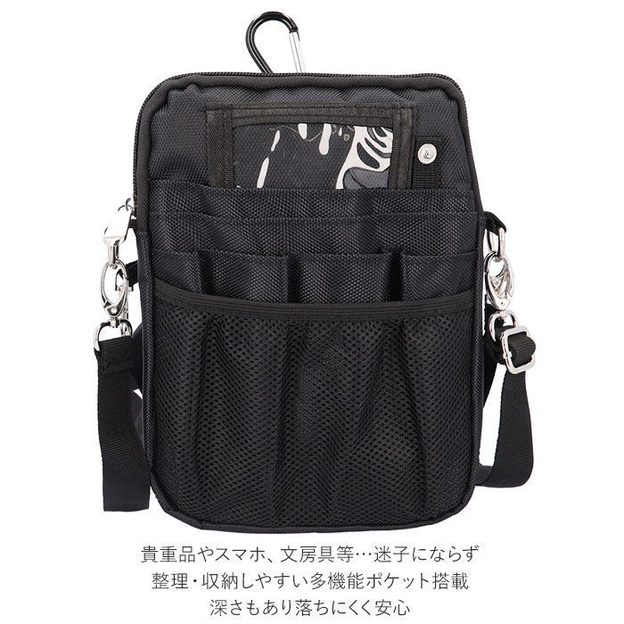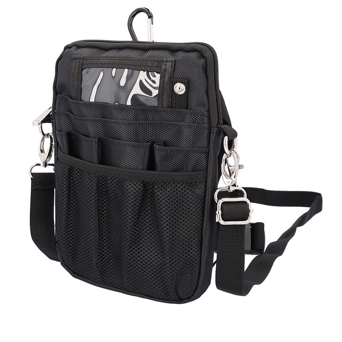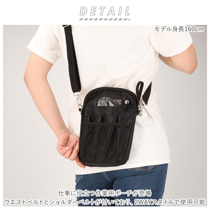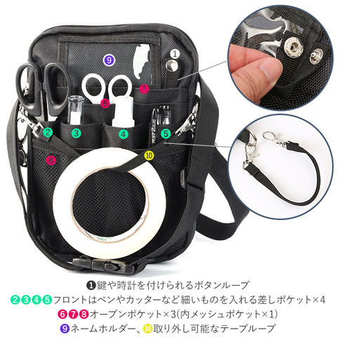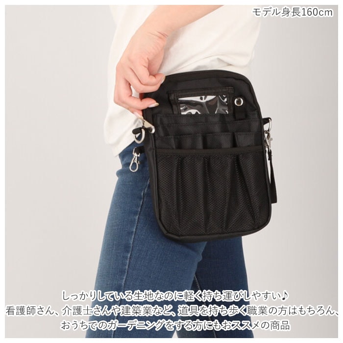 | 商品説明 | 仕事に役立つ作業用ポーチが登場。貴重品やスマホ、文房具等…迷子にならず整理・収納しやすい多機能ポケット搭載。深さもあり落ちにくく安心。ガバッと大きく開くメインルームの中にはファスナーポケットとオープンポケットを1つずつ装備。フロントはペンやカッターなど細いものを入れる差しポケット×4、オープンポケット×3(内メッシュポケット×1)、ネームホルダー、取り外し可能なテープループ、鍵や時計を付けられるボタンループ。背面はメッシュポケット×1、オープンポケット×1とナスカン、ズボンなどのベルトループに引っ掛けられるカラビナを装備。ウエストベルトとショルダーベルトが付いており2WAYスタイルで使用可能。またショルダーベルトは肩掛けだけでなく斜め掛けもできる◎しっかりしている生地なのに軽く持ち運びしやすい♪看護、介護士さんや建築業など道具を持ち歩く職業の方はもちろん、お家でのガーデニングをする方にもおススメの商品。 |