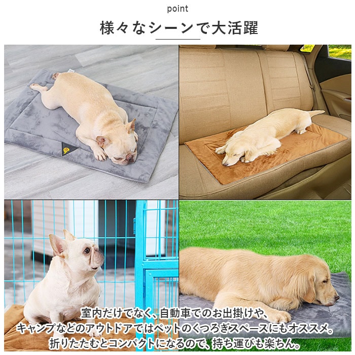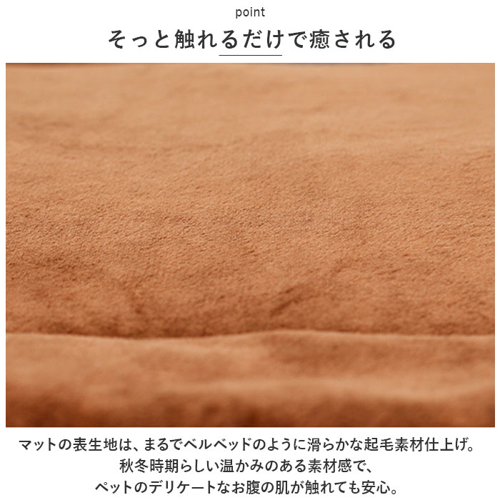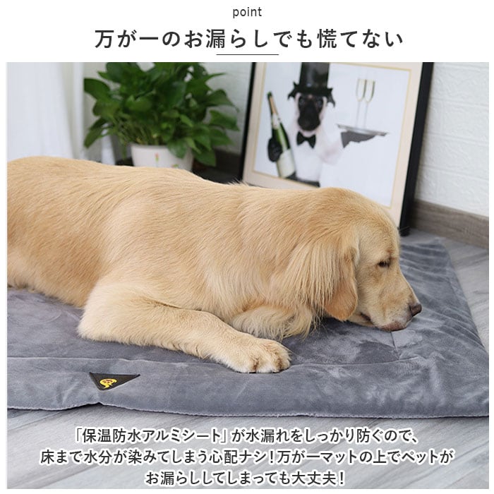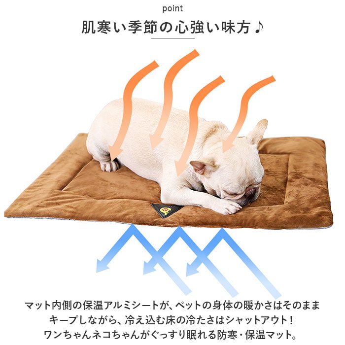 | 商品説明 | フローリングの床の上でも、ほっこり暖か。肌寒い季節もワンちゃん・ネコちゃん快適「防寒保温ペットマット(Sサイズ)」が新登場。【肌寒い季節の心強い味方♪】マット内側の保温アルミシートが、ペットの身体の暖かさはそのままキープしながら、冷え込む床の冷たさはシャットアウト!ワンちゃんネコちゃんがぐっすり眠れる防寒・保温マット。【4層構造が暖かさのヒミツ】マットの表面から「滑らかな起毛生地」+「保温防水アルミシート」+「ふわふわの中綿層」+「滑り止め底面シート」を重ねて仕上げた「4層構造」がぽかぽかの暖かさのヒミツ。【そっと触れるだけで癒される】マットの表生地は、まるでベルベッドのように滑らかな起毛素材仕上げ。秋冬時期らしい温かみのある素材感で、ペットのデリケートなお腹の肌が触れても安心。【底面滑り止め加工済み】底面はドット状のシリコン滑り止め加工済み。マットがソファの上から滑り落ちたり、ペットが勢いよく飛び込んでもマットのズレを直す手間が少なくて済むのも嬉しいポイント。【万が一のお漏らしでも慌てない】・「保温防水アルミシート」が水漏れをしっかり防ぐので、床まで水分が染みてしまう心配ナシ!万が一マットの上でペットがお漏らししてしまっても大丈夫!【ご家庭でカンタンお洗濯】マットのメイン素材は、取り扱いが楽なポリエステル生地なので、優しく手洗いすればご家庭で手軽にお洗濯OK!こまめにお手入れしていつでも清潔な使い心地。(※タンブラー乾燥はご利用いただけません。)【ペットケージに最適サイズ】小型~中型のワンちゃんや、ネコちゃんの寝床にちょうどよい61cm×46cmのSサイズ。フロアやソファにそのまま敷いて使えるのはもちろん、ペットゲージやペットベッドの中敷きマットにも最適。お使いのペットヒーターの上に重ねれば、ペットの身体に優しいマイルドな暖かさに。【様々なシーンで大活躍】室内だけでなく、自動車でのお出掛けや、キャンプなどのアウトドアではペットのくつろぎスペースにもオススメ。折りたたむとコンパクトになるので、持ち運びも楽ちん。 |