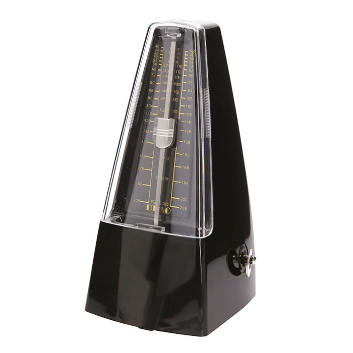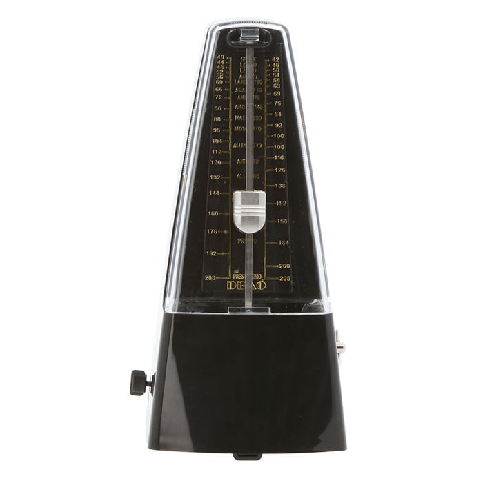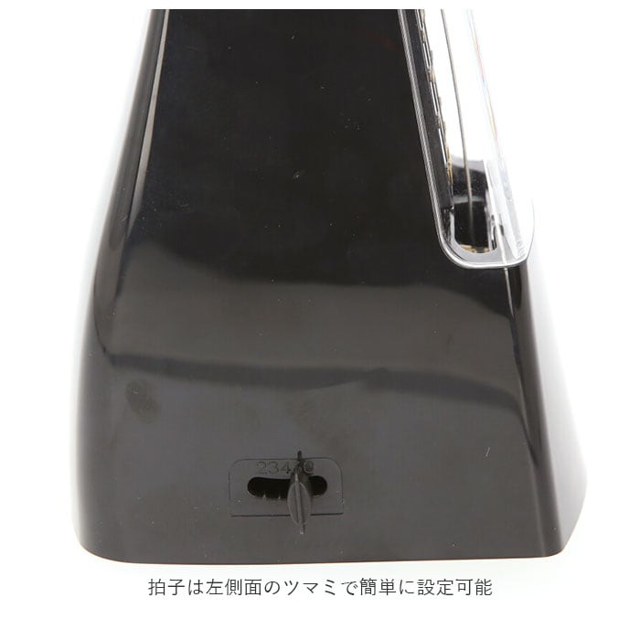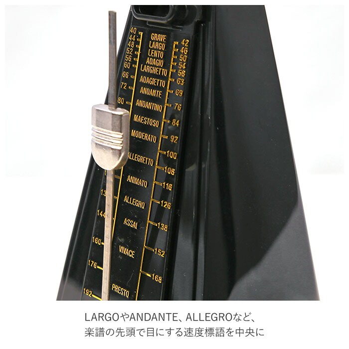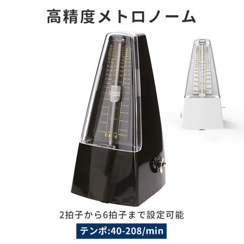 | 商品説明 | 音楽室やピアノ教室でお馴染み♪カチカチと正確なテンポを刻む「メトロノーム」が新登場。メトロノームは、振り子の原理でさまざまなテンポを刻むことのできる、ドイツ人メルツェルが発明した機械。正面の目盛りプレートには、1分間に刻まれる4分音符の数を示す「メトロノーム記号」をBPM40~BPM208まで、数字で読みやすく表示。LARGO(ラルゴ)やANDANTE(アンダンテ)、ALLEGRO(アレグロ)など、楽譜の先頭で目にする速度標語は中央に。2拍子・3拍子・4拍子など、拍子の設定は左側面のツマミで簡単に設定が可能。(※2拍子から6拍子まで設定できます。)使い方はとっても簡単!(※ご使用前にメトロノーム底面のストッパーを外してください。)1.正面の透明カバーを外してから、左側面のツマミで拍子を設定。2.右側面の巻きカギを時計回りに回します。3.振り子の遊錘(ゆうすい)を上下して、速度を設定。4.軽く振り子の針を左右に揺らせばテンポを刻み始めます。ご自宅でのピアノ練習や、アコースティックギター演奏にはもちろん、音楽教室でのリズム教育などにも大活躍。 |