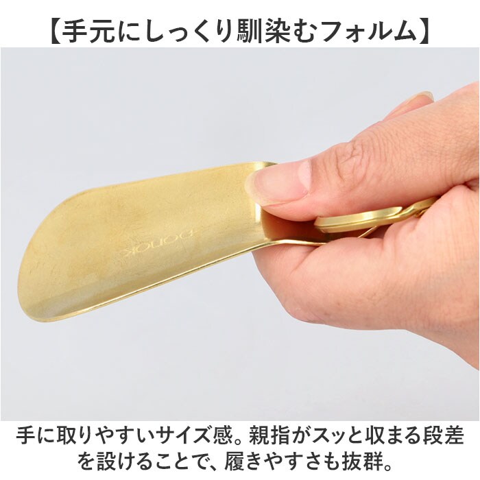 | 商品説明 | 【どこでも靴を履く動作をサポート】持ち歩きやすく、色んなシーンで活躍!「DONOK Braciasシューホーン」が新登場。【スタイリッシュなオール真鍮】使うほどに味わいの増す真鍮で作られ、高級感のある仕上がりに。ビジネスシーンなどでも重宝。【手元にしっくり馴染むフォルム】手に取りやすいサイズ感。親指がスッと収まる段差を設けることで、履きやすさも抜群。【持ち歩きやすいキーホルダータイプ】ベルトループなどに引っ掛けOK。後ろ側に付けてポケットにしまえば、音も気にせず快適。【長く愛用できてギフトにも】使い込むことで愛着の湧く真鍮アイテム。安心の日本製で、家族や大切な方への贈り物にも最適。 |