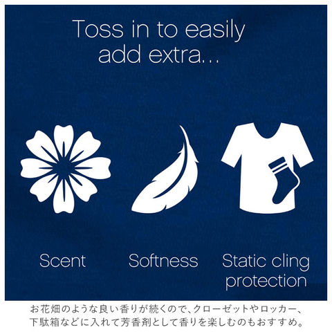 | 商品説明 | フレッシュフローラルの香りにうっとり。シートタイプの乾燥機用柔軟剤、ダウニーシート エイプリル120枚入り。衣類をふんわりと柔らかく仕上げ、静電気やまとわりつきを防いでくれるお洗濯アイテム。使い方はとっても簡単。箱からシートを引き出し、乾燥機に洗濯ものと一緒に入れるだけ。乾燥中も良い香りに包まれてご機嫌。標準使用量は乾燥1回につき1枚。乾燥が終わったらそのままごみ箱へ。手軽に使えてとっても便利。お花畑のような良い香りが続くので、クローゼットやロッカー、下駄箱などに入れて芳香剤として香りを楽しむのもおすすめ。シートの大きさは、約16cm×22cm。120枚入の大容量タイプ。 |