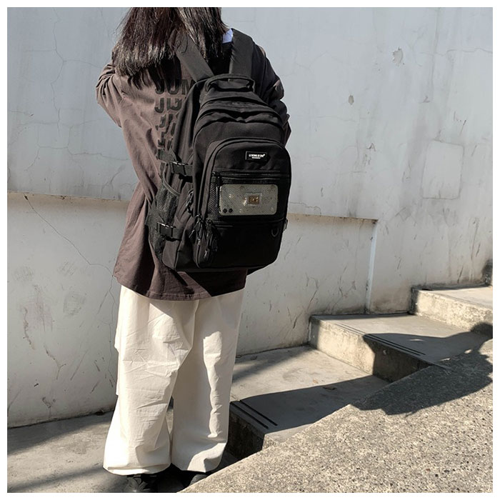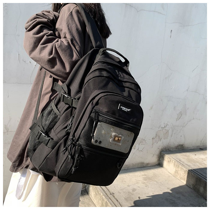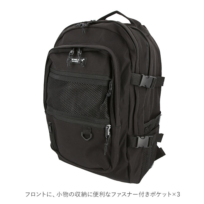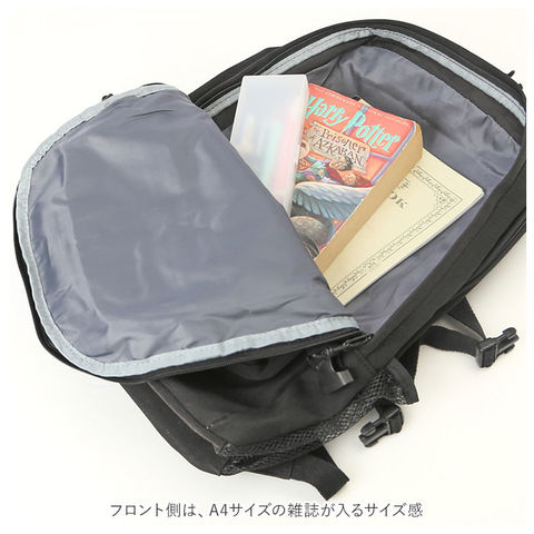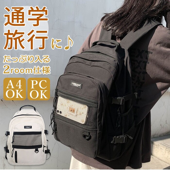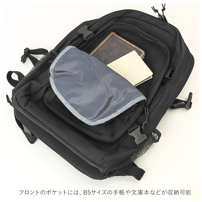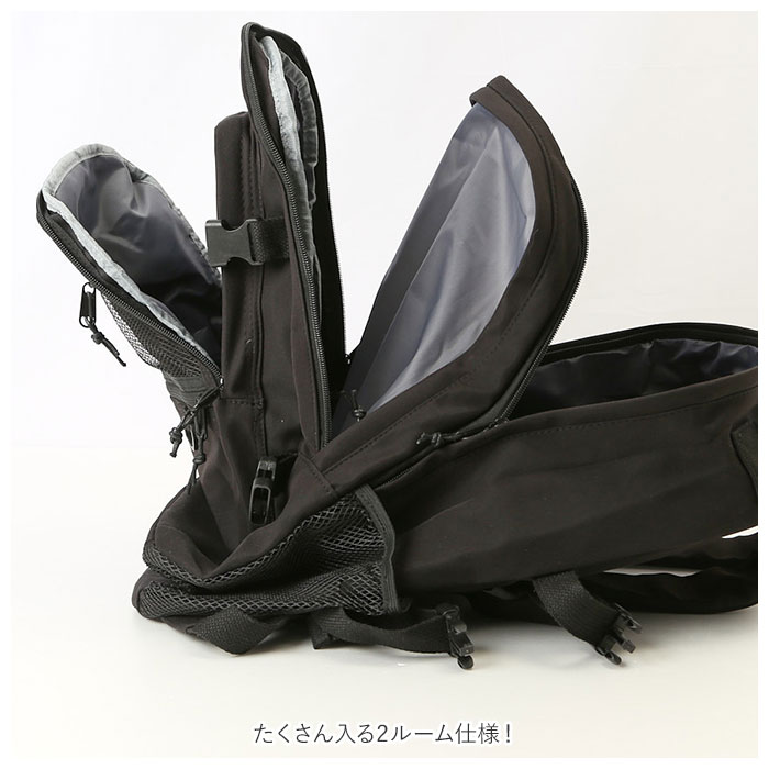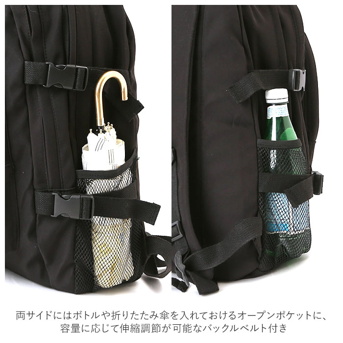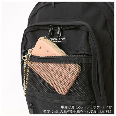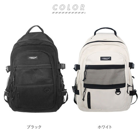 | 商品説明 | シンプルかつユニセックスで使える通学リュックサックが新登場。たくさん入る2ルーム仕様!フロント側は、A4サイズの雑誌が入るサイズ感。メインルームは、タブレットやノートPCの収納に便利なクッション入りのオープンポケットを装備。フロントのポケットには、B5サイズの手帳や文庫本などが収納可能。さらに小物の収納に便利なファスナー付きポケット×3付き。そのうち1つは中身が見えるメッシュポケットになっているから、パスケースなど頻繁に出し入れする小物を入れておくと便利♪両サイドにはボトルや折りたたみ傘を入れておけるオープンポケットに、容量に応じて伸縮調節が可能なバックルベルト付き。たくさん入る大容量設計なので、通学用としてはもちろん、旅行やママバッグとして使うのもおススメ。 |