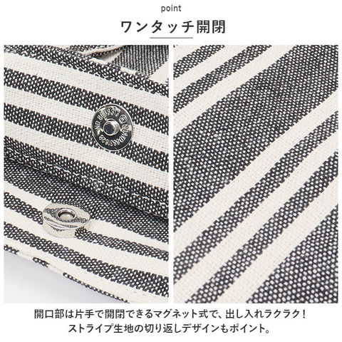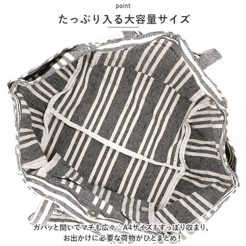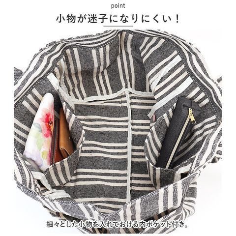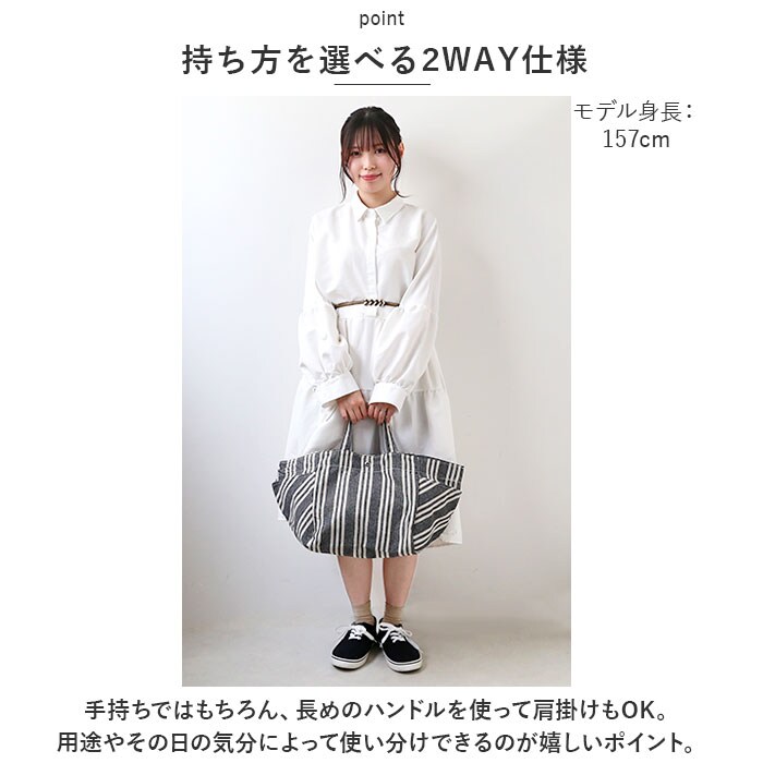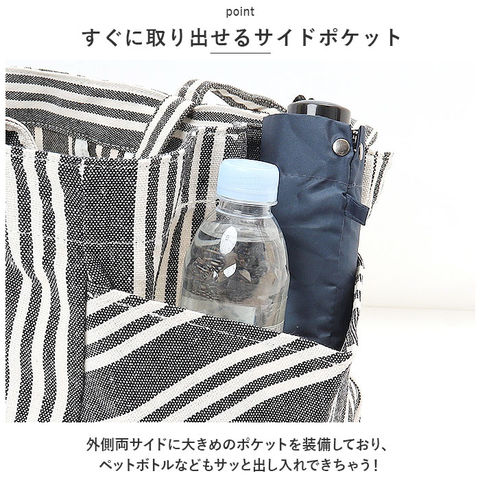 | 商品説明 | 収納力ばっちり!用途いろいろ「マルチストライプ 2WAYトート」が新登場。【ナチュラルなストライプ デザイン】軽やかなコットン素材を使用。表面・裏面ともに全面ストライプ柄で、ナチュラルな風合いのトートバッグ。【持ち方を選べる2WAY仕様】手持ちではもちろん、長めのハンドルを使って肩掛けもOK。用途やその日の気分によって使い分けできるのが嬉しいポイント。【ワンタッチ開閉】開口部は片手で開閉できるマグネット式で、出し入れラクラク!【たっぷり入る大容量サイズ】ガバッと開いてマチも広々☆A4サイズもすっぽり収まり、お出かけに必要な荷物がひとまとめ!【小物が迷子になりにくい!】細々とした小物を入れておける内ポケット付き。【すぐに取り出せるサイドポケット】外側両サイドに大きめのポケットを装備しており、ペットボトルなどもサッと出し入れできちゃう!ストライプ生地の切り返しデザインもポイント。【折りたためるバッグ】折りたたんでいつものバッグにINできる柔らか素材。エコバッグやサブバッグとして使えて便利◎【トラベルやマザーズバッグとしても】荷物が多くなりがちな旅行やレジャー、お子さまとのお出かけにも大活躍!【ポケット仕様】内側:オープンポケット×2サイド:オープンポケット×2 |