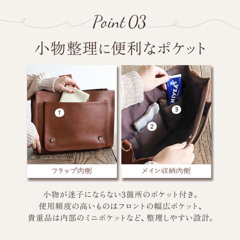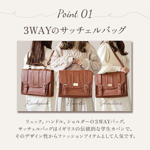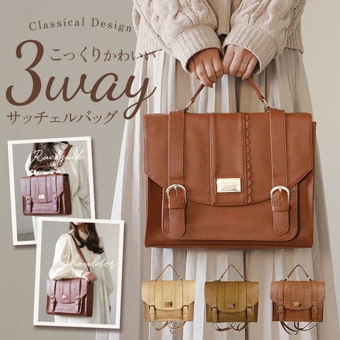 | 商品説明 | 高級さと程よいかわいさが魅力】定番のサッチェルバッグにスカラップとゴールドパーツを組み合わせたアイテム。【フェミニンな印象】フロントにスカラップを施しほんのり甘めなデザインに。【上品なレザー調の見た目】合皮を使用しレザー調の見た目が上品さアリ!お手入れ楽ちんなのも◎【かわいい見た目でしっかり入る】毎日のお出かけに便利なサイズ感がGOOD。マチ幅もありポーチもしっかり入る。【書類や教科書・ノート類も】A4サイズ対応なので通勤通学にもピッタリ!教科書やノートも収納可能。【パチンと止まる内ベルト付き】メインルームの開口部に荷物の飛び出しを防ぐ内ベルトを搭載。【小物を分けて収納】メインルームの内・外側にオープンポケットを配置し、小物が迷子になりにくい。【嬉しい3WAY仕様】手持ち・リュック・ショルダーで使用可能。シーンやコーデに合わせてスタイルをチョイス。【ゴールドパーツで高級感UP】ロゴプレートや金具はゴールドパーツを採用し高級感もプラス。【ホックはマグネット式】ホック部分はマグネットボタンを使用し、開け閉めがしやすいのも嬉しいポイント。【ポケット仕様】メインルーム・・・オープンポケット×2フロント・・・オープンポケット×1 |