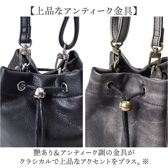 | 商品説明 | 【こなれた大人スタイル】クラシカルな佇まい、ヴィンテージデザイン巾着ショルダーバッグ♪【使いやすいドローコード】口をきゅっと絞るドローコードはデザインのアクセントにもなり、荷物の出し入れもスムーズ!【コンパクトでも頼れる収納力】小ぶりなサイズながらしっかりマチがあるから、お出かけに必要なアイテムをきちんと収納できる◎【質感が魅力】ヴィンテージ加工を施したフェイクレザーが、こなれ感のある大人の雰囲気を演出してくれる〇【上品なアンティーク金具】艶あり&アンティーク調の金具がクラシカルで上品なアクセントをプラス。※ブラックは艶ありの金具、ダークブラック&ダークブラウンはアンティーク調の金具です【長さ調節でスタイル自在】斜め掛けも肩掛けも叶うショルダーベルトで、その日のコーディネートに合わせた着こなしが楽しめる。 |