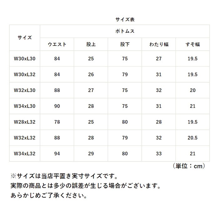 | サイズ | 【メンズ】 ・W30×L30 ・W30×L32 ・W32×L30 ・W34×L30 ・W28×L32 ・W32×L32 ・W34×L32 ※サイズについて詳細は、商品画像の中にあるサイズ表をご覧くださいませ。 |