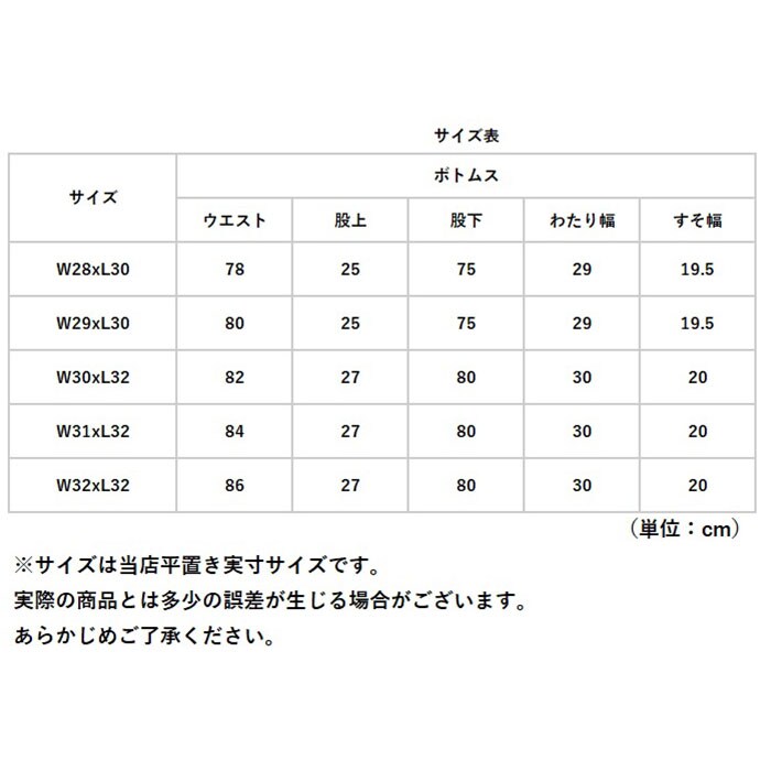 | サイズ | [メンズ] ・W28×L30 ・W29×L30 ・W30×L32 ・W31×L32 ・W32×L32 ※サイズについて詳細は、商品画像の中にあるサイズ表をご覧くださいませ。 |