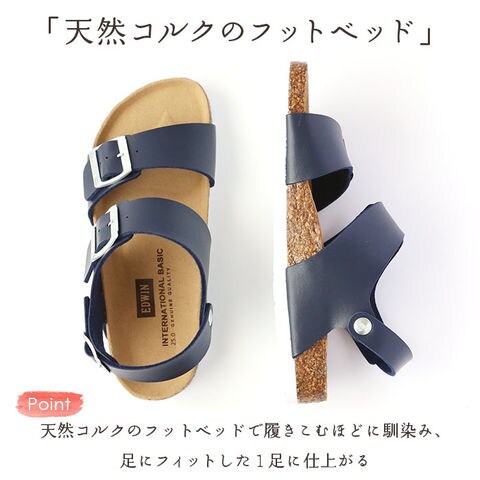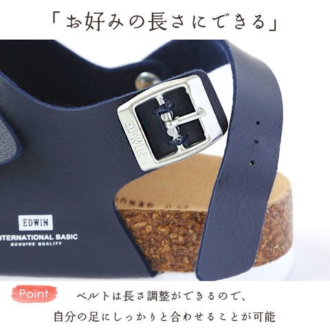 | 商品説明 | 歩きやすさに、とことんこだわった大人気 EDWIN の定番サンダル!かかとのストラップで、足をしっかりホールド!天然コルクのフットベッドで履きこむほどに馴染み、自分の足にフィットした1足に仕上がる深いヒールカップと足指付け根のトウバーで足をしっかりサポート!ベルトは長さ調整ができるので、自分の足にしっかりと合わせることが可能ソールは厚さがしっかりあり、歩行時の衝撃をしっかり吸収してくれるアウトソールは適度なグリップ力があり、滑りにくい! |