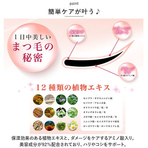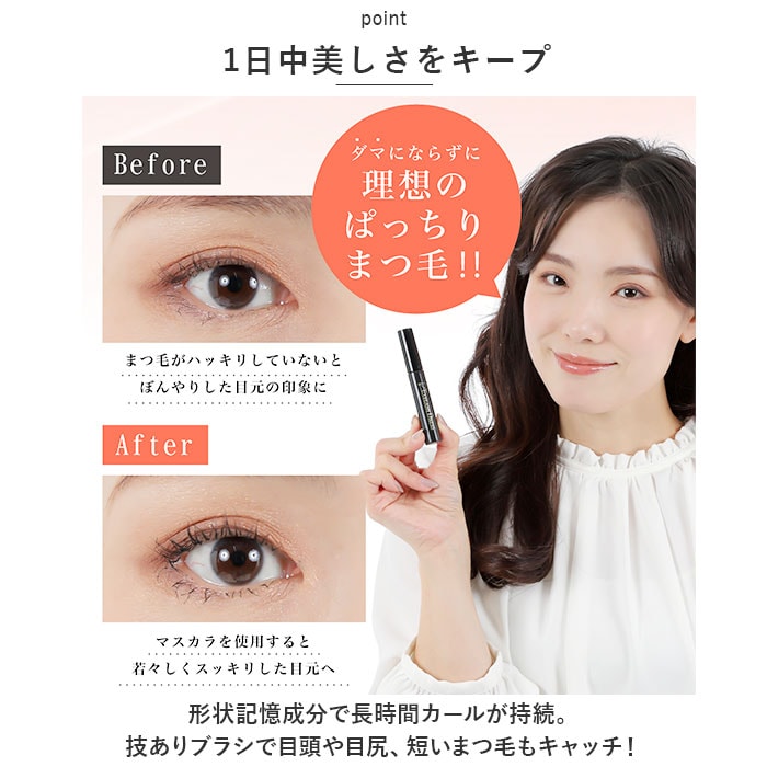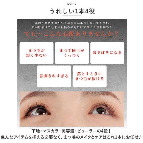 | 商品説明 | 年齢を重ねた目元に♪メイクしながらまつ毛ケアできる「Eyelash Dress 大人の黒い美容液マスカラ」が新登場。【うれしい1本4役】下地・マスカラ・美容液・ビューラーの4役!色んなアイテムを揃える必要なく、まつ毛のメイクとケアはこれ1本にお任せ♪【簡単ケアが叶う♪】保湿効果のある植物エキスと、ダメージをケアするアミノ酸入り。美容成分が92%配合されており、ハリやコシをサポート。【1日中美しさをキープ】形状記憶成分で長時間カールが持続。技ありブラシで目頭や目尻、短いまつ毛もキャッチ!ダマになりにくく、理想のぱっちりまつ毛に。【使い勝手ばっちりなフィルムタイプ】汗や水に強いウォータープルーフ仕様!にじまず美しい仕上がりをキープしつつ、お湯のみで簡単オフできるからリムーバーも不要。【4つの成分不使用で安心】パラベン・ファイバー・香料・合成着色料は不使用!どなたでも安心して使えるのが嬉しい♪【若々しくスッキリとした目元に】目元を華やかにメイクすることで、印象もチェンジ☆年齢とともに増える目元のお悩みを解決してくれるアイテム! |
