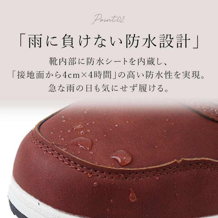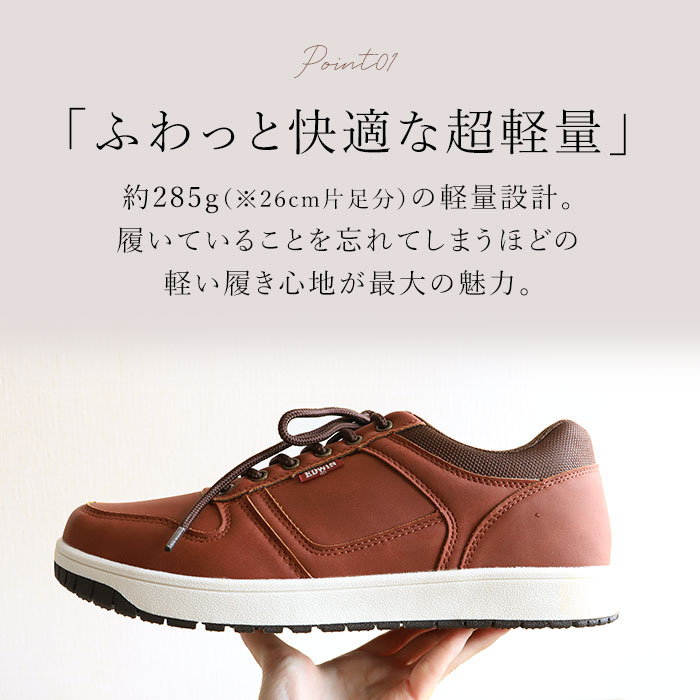 | 商品説明 | 【雨の日も晴れの日も、毎日履ける!】日本発No.1デニムブランド「EDWIN」から「メンズ 防水・防滑スニーカー 7975」が新登場!【雨に負けない!防水設計】靴内部に防水シートを内蔵し「接地面から4cm×4時間」の高い防水性を実現!急な雨の日も大活躍。※完全防水仕様ではありません。【足の甲からの水の侵入をブロック】さらにアッパーとシュータンが繋がったガセット仕様を採用!足の甲からも水が浸入しにくい造り。【ふわっと快適、驚きの軽さ】片足約285gの軽量設計。履いていることを忘れる程の軽やかな履き心地で、足運びがスムーズ。※26.0cmサイズの商品、付属のインソールの重量を含む、片足分の計測重量です。【疲れにくいふんわりクッション】スポンジ状のカップインソールが着地時の衝撃をふんわり吸収。快適な歩行スタイルをサポート。【柔らかな履き口がフィット】履き口周りも厚みのあるクッション生地で仕上げ、足首やかかとを靴ズレから優しく保護。【軽量なのに滑りにくい!】しっかりと凹凸の刻まれた防滑ソールで、雨に濡れた路面やフロアーもがっちりグリップ。【調整自在なシューレーススタイル】足の甲幅に合わせて調整が自在な、クラシックなシューレーススタイル。【お手入れ簡単、いつでも清潔】カップインソールは取り外しができるので、手軽に水洗いができていつでも清潔さをキープ。【清潔感のある足元を演出】ツヤ感を抑えたスムーズな合皮に、ホワイトソールを合わせた清潔感溢れるルックスが好印象。スポッと履くだけ、ちょっぴりワイルドなメンズコーデの完成!【EDWIN History】・1961年に日本で初めて国内縫製のブルージーンズを誕生させた「EDWIN」。創業から現在に至るまで、永遠の定番「EDWIN 503」を始め、時代と共に進化し続けるNo.1デニムブランド。 |
