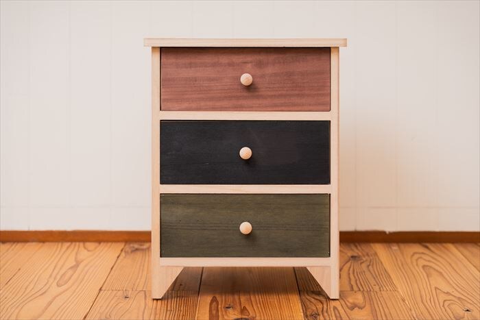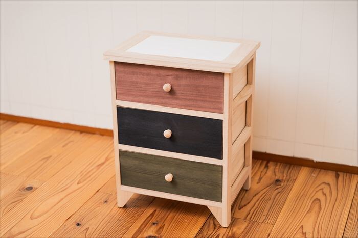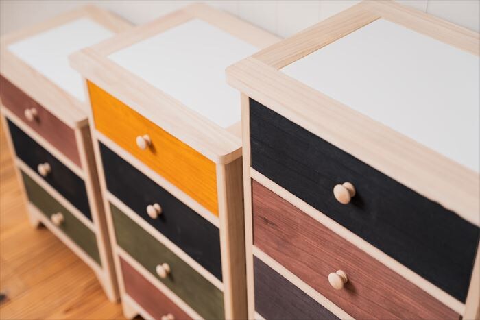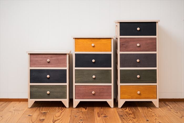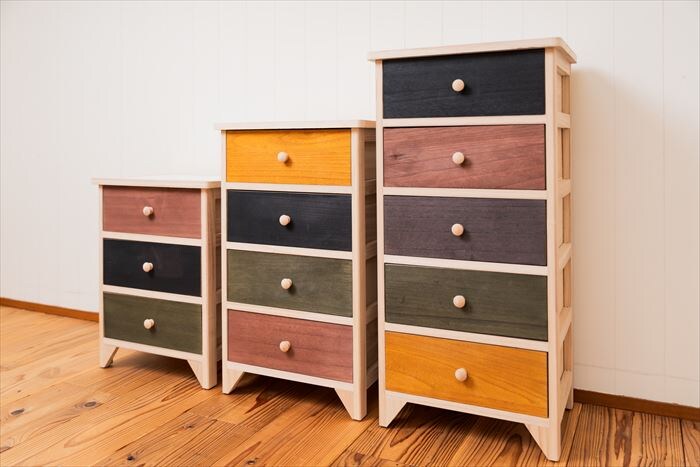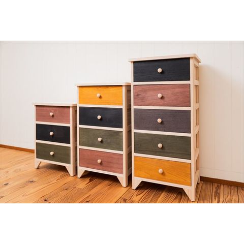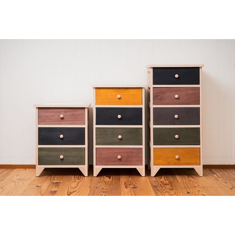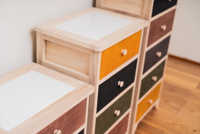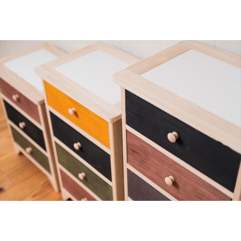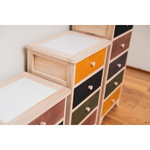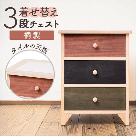 | 商品説明 | 着せ替えられる桐製チェスト。引き出しを入れ替えることで着せ替えが出来るチェスト。どの色の引き出しに何を入れるか分けて使うと、探し物が見つかりやすくなります。天板はタイルになっているのでキッチンでの使用もオススメ。完成品で組み立て不要なので、すぐに使えるのも嬉しいポイントです。 |